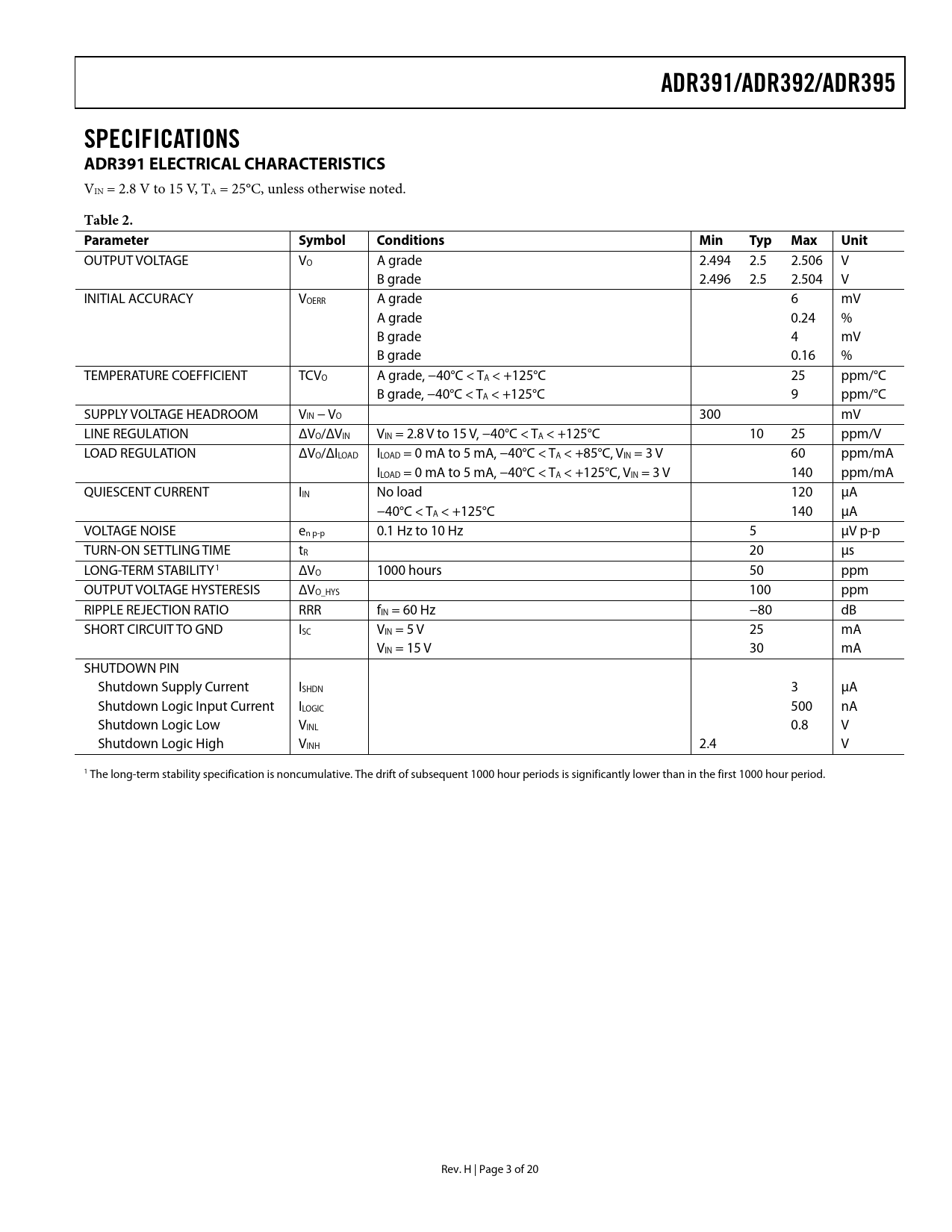 link to page 3 ADR391/ADR392/ADR395SPECIFICATIONS ADR391 ELECTRICAL CHARACTERISTICS VIN = 2.8 V to 15 V, TA = 25°C, unless otherwise noted. Table 2. Parameter SymbolConditionsMinTypMaxUnit OUTPUT VOLTAGE VO A grade 2.494 2.5 2.506 V B grade 2.496 2.5 2.504 V INITIAL ACCURACY VOERR A grade 6 mV A grade 0.24 % B grade 4 mV B grade 0.16 % TEMPERATURE COEFFICIENT TCVO A grade, −40°C < TA < +125°C 25 ppm/°C B grade, −40°C < TA < +125°C 9 ppm/°C SUPPLY VOLTAGE HEADROOM VIN − VO 300 mV LINE REGULATION ΔVO/ΔVIN VIN = 2.8 V to 15 V, −40°C < TA < +125°C 10 25 ppm/V LOAD REGULATION ΔVO/ΔILOAD ILOAD = 0 mA to 5 mA, −40°C < TA < +85°C, VIN = 3 V 60 ppm/mA ILOAD = 0 mA to 5 mA, −40°C < TA < +125°C, VIN = 3 V 140 ppm/mA QUIESCENT CURRENT IIN No load 120 μA −40°C < TA < +125°C 140 μA VOLTAGE NOISE en p-p 0.1 Hz to 10 Hz 5 μV p-p TURN-ON SETTLING TIME tR 20 μs LONG-TERM STABILITY1 ΔVO 1000 hours 50 ppm OUTPUT VOLTAGE HYSTERESIS ΔVO_HYS 100 ppm RIPPLE REJECTION RATIO RRR fIN = 60 Hz −80 dB SHORT CIRCUIT TO GND ISC VIN = 5 V 25 mA VIN = 15 V 30 mA SHUTDOWN PIN Shutdown Supply Current ISHDN 3 μA Shutdown Logic Input Current ILOGIC 500 nA Shutdown Logic Low VINL 0.8 V Shutdown Logic High VINH 2.4 V 1 The long-term stability specification is noncumulative. The drift of subsequent 1000 hour periods is significantly lower than in the first 1000 hour period. Rev. H | Page 3 of 20 Document Outline FEATURES APPLICATIONS GENERAL DESCRIPTION PIN CONFIGURATION TABLE OF CONTENTS REVISION HISTORY SPECIFICATIONS ADR391 ELECTRICAL CHARACTERISTICS ADR392 ELECTRICAL CHARACTERISTICS ADR395 ELECTRICAL CHARACTERISTICS ABSOLUTE MAXIMUM RATINGS THERMAL RESISTANCE ESD CAUTION TYPICAL PERFORMANCE CHARACTERISTICS TERMINOLOGY THEORY OF OPERATION DEVICE POWER DISSIPATION CONSIDERATIONS SHUTDOWN MODE OPERATION APPLICATIONS INFORMATION BASIC VOLTAGE REFERENCE CONNECTION Stacking Reference ICs for Arbitrary Outputs A Negative Precision Reference without Precision Resistors General-Purpose Current Source High Power Performance with Current Limit CAPACITORS Input Capacitor Output Capacitor OUTLINE DIMENSIONS ORDERING GUIDE