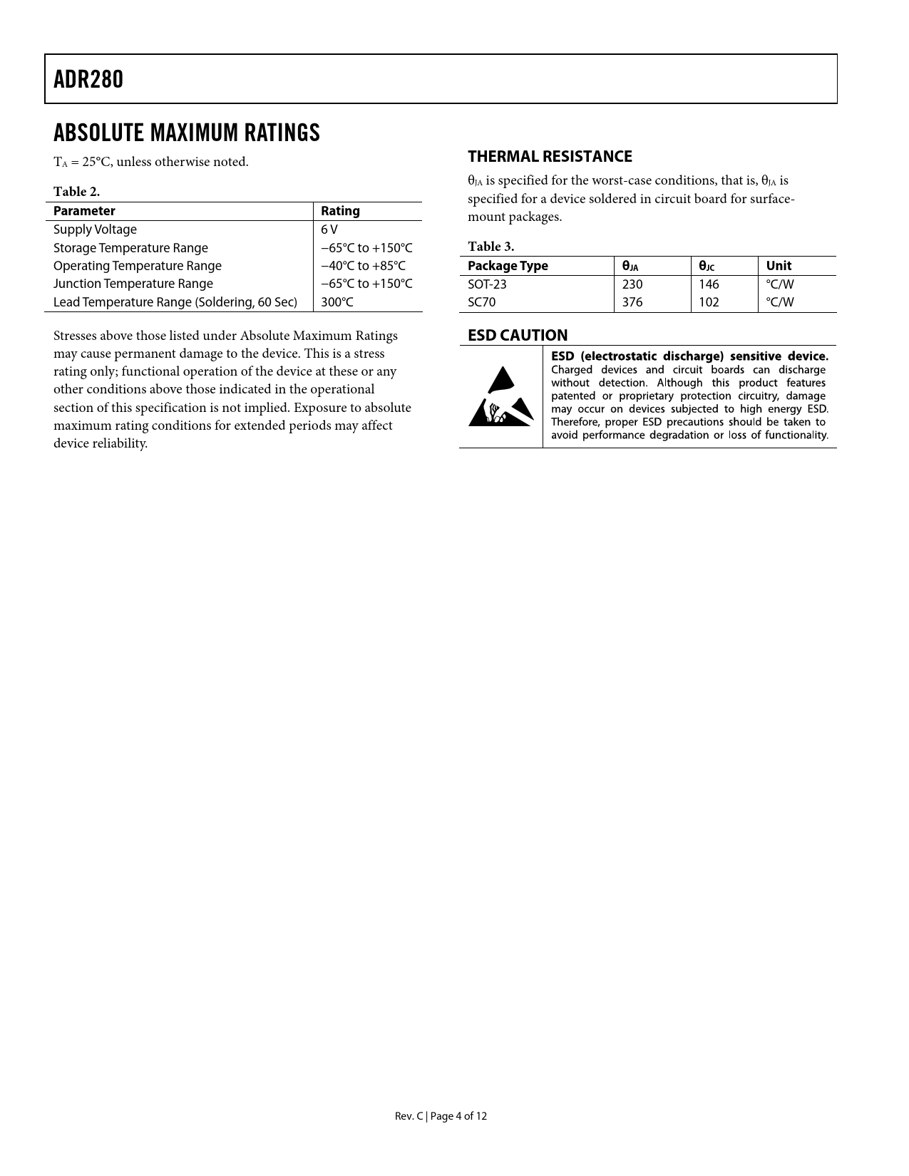 ADR280ABSOLUTE MAXIMUM RATINGS T THERMAL RESISTANCE A = 25°C, unless otherwise noted. θJA is specified for the worst-case conditions, that is, θJA is Table 2. specified for a device soldered in circuit board for surface- Parameter Rating mount packages. Supply Voltage 6 V Storage Temperature Range −65°C to +150°C Table 3. Operating Temperature Range −40°C to +85°C Package TypeθJAθJC Unit Junction Temperature Range −65°C to +150°C SOT-23 230 146 °C/W Lead Temperature Range (Soldering, 60 Sec) 300°C SC70 376 102 °C/W Stresses above those listed under Absolute Maximum Ratings ESD CAUTION may cause permanent damage to the device. This is a stress rating only; functional operation of the device at these or any other conditions above those indicated in the operational section of this specification is not implied. Exposure to absolute maximum rating conditions for extended periods may affect device reliability. Rev. C | Page 4 of 12 Document Outline FEATURES APPLICATIONS GENERAL DESCRIPTION PIN CONFIGURATIONS TABLE OF CONTENTS REVISION HISTORY SPECIFICATIONS ELECTRICAL CHARACTERISTICS ABSOLUTE MAXIMUM RATINGS THERMAL RESISTANCE ESD CAUTION TYPICAL PERFORMANCE CHARACTERISTICS THEORY OF OPERATION APPLICATIONS INFORMATION LOW COST, LOW POWER CURRENT SOURCE Precision Low Power Current Source Boosted Current Source Negative Reference Boosted Reference with Scalable Output GSM and 3G Mobile Station Applications OUTLINE DIMENSIONS ORDERING GUIDE