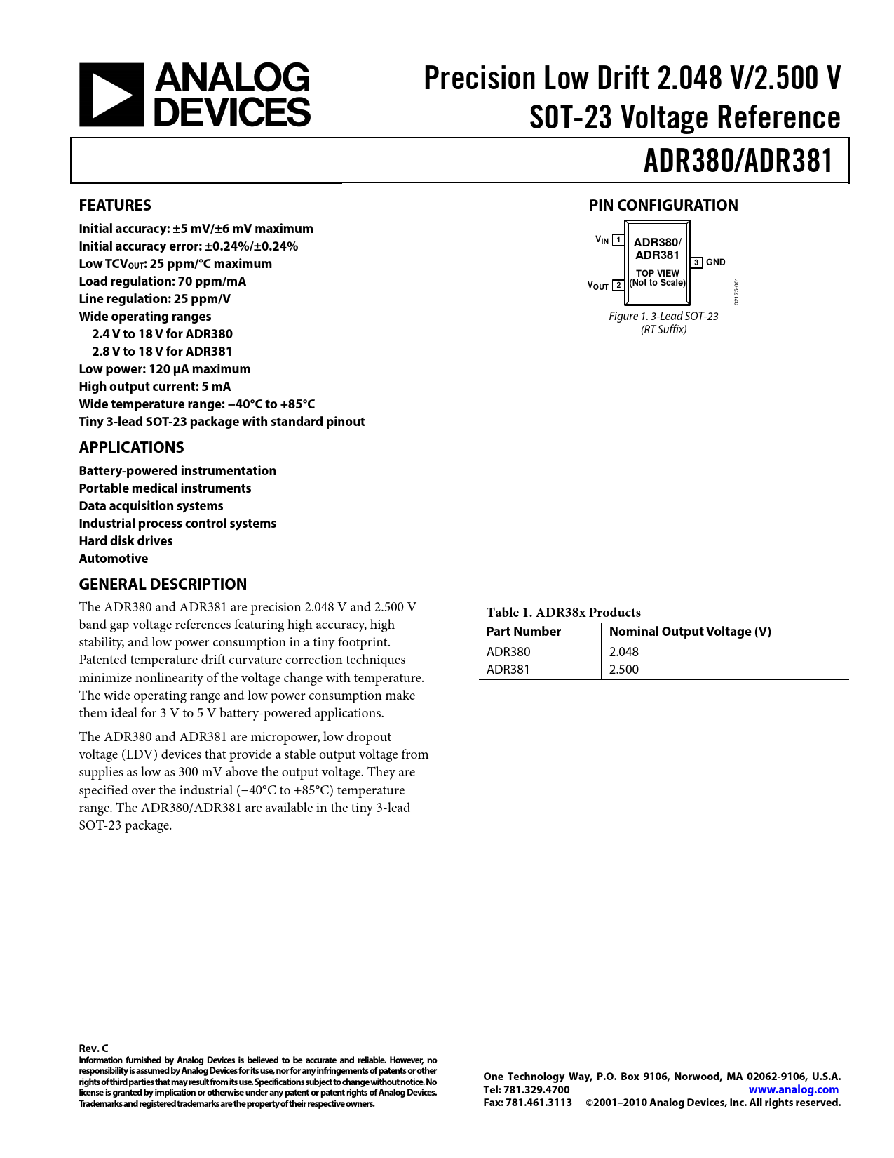 stability, and low power consumption in a tiny footprint. ADR380 2.048 Patented temperature drift curvature correction techniques ADR381 2.500 minimize nonlinearity of the voltage change with temperature. The wide operating range and low power consumption make them ideal for 3 V to 5 V battery-powered applications. The ADR380 and ADR381 are micropower, low dropout voltage (LDV) devices that provide a stable output voltage from supplies as low as 300 mV above the output voltage. They are specified over the industrial (−40°C to +85°C) temperature range. The ADR380/ADR381 are available in the tiny 3-lead SOT-23 package.