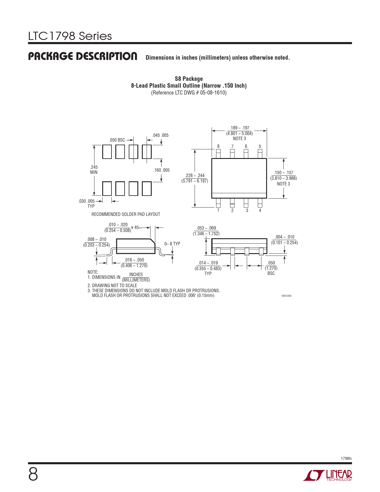 (Reference LTC DWG # 05-08-1610) .189 – .197 (4.801 – 5.004) .045 .005 NOTE 3 .050 BSC 8 7 6 5 .245 MIN .160 .005 .150 – .157 .228 – .244 (3.810 – 3.988) (5.791 – 6.197) NOTE 3 .030 .005 TYP 1 2 3 4 RECOMMENDED SOLDER PAD LAYOUT .010 – .020 ¥ 45∞ (0.254 – 0.508) .053 – .069 (1.346 – 1.752) .008 – .010 .004 – .010 0– 8 TYP (0.203 – 0.254) (0.101 – 0.254) .016 – .050 .014 – .019 .050 (0.406 – 1.270) (0.355 – 0.483) (1.270) NOTE: INCHES TYP BSC 1. DIMENSIONS IN (MILLIMETERS) 2. DRAWING NOT TO SCALE 3. THESE DIMENSIONS DO NOT INCLUDE MOLD FLASH OR PROTRUSIONS. MOLD FLASH OR PROTRUSIONS SHALL NOT EXCEED .006" (0.15mm) SO8 0303 1798fc 8 Document Outline FEATURES DESCRIPTION APPLICATIONS TYPICAL APPLICATION ABSOLUTE MAXIMUM RATINGS PIN CONFIGURATION ORDER INFORMATION AVAILABLE OPTIONS ELECTRICAL CHARACTERISTICS TYPICAL PERFORMANCE CHARACTERISTICS PIN FUNCTIONS BLOCK DIAGRAM APPLICATIONS INFORMATION PACKAGE DESCRIPTION REVISION HISTORY TYPICAL APPLICATION RELATED PARTS