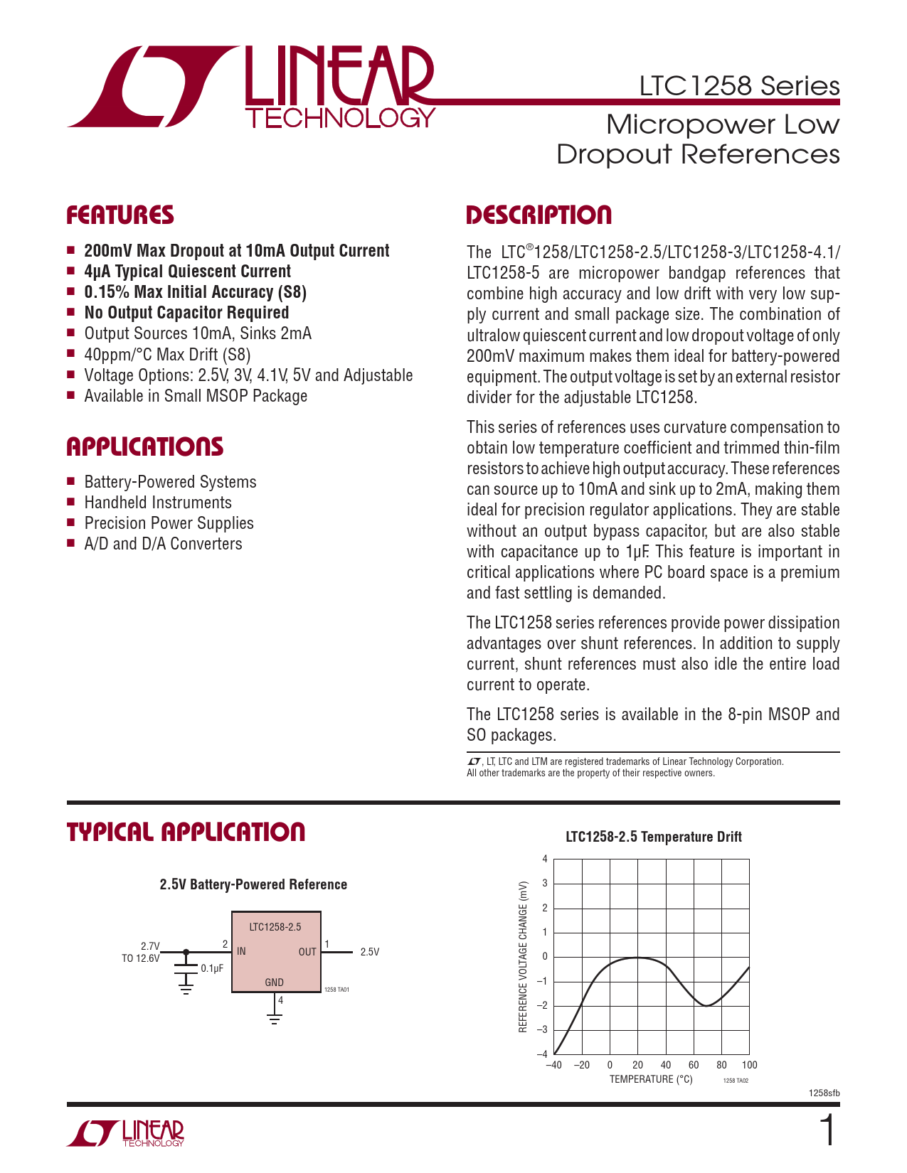 LTC1258 Series Micropower Low Dropout References FEATURESDESCRIPTION n 200mV Max Dropout at 10mA Output Current The LTC®1258/LTC1258-2.5/LTC1258-3/LTC1258-4.1/ n 4μA Typical Quiescent Current LTC1258-5 are micropower bandgap references that n 0.15% Max Initial Accuracy (S8) combine high accuracy and low drift with very low sup- n No Output Capacitor Required ply current and small package size. The combination of n Output Sources 10mA, Sinks 2mA ultralow quiescent current and low dropout voltage of only n 40ppm/°C Max Drift (S8) 200mV maximum makes them ideal for battery-powered n Voltage Options: 2.5V, 3V, 4.1V, 5V and Adjustable equipment. The output voltage is set by an external resistor n Available in Small MSOP Package divider for the adjustable LTC1258. This series of references uses curvature compensation to APPLICATIONS obtain low temperature coeffi cient and trimmed thin-fi lm resistors to achieve high output accuracy. These references n Battery-Powered Systems can source up to 10mA and sink up to 2mA, making them n Handheld Instruments ideal for precision regulator applications. They are stable n Precision Power Supplies without an output bypass capacitor, but are also stable n A/D and D/A Converters with capacitance up to 1μF. This feature is important in critical applications where PC board space is a premium and fast settling is demanded. The LTC1258 series references provide power dissipation advantages over shunt references. In addition to supply current, shunt references must also idle the entire load current to operate. The LTC1258 series is available in the 8-pin MSOP and SO packages. L, LT, LTC and LTM are registered trademarks of Linear Technology Corporation. All other trademarks are the property of their respective owners. TYPICAL APPLICATIONLTC1258-2.5 Temperature Drift 4 2.5V Battery-Powered Reference 3 2 LTC1258-2.5 1 2.7V 2 1 IN OUT 2.5V TO 12.6V TAGE CHANGE (mV) 0 0.1μF GND –1 1258 TA01 4 –2 REFERENCE VOL –3 –4 –40 –20 0 20 40 60 80 100 TEMPERATURE (°C) 1258 TA02 1258sfb 1