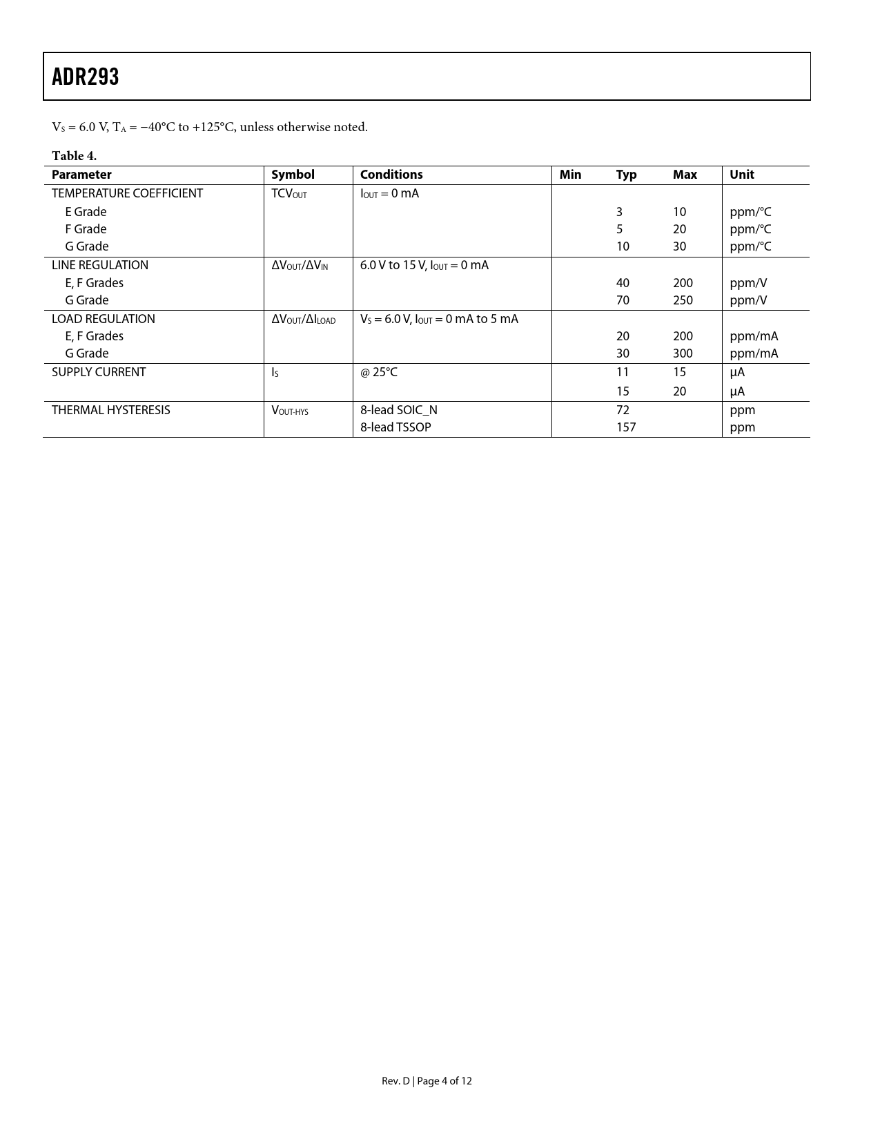 Pages / Page12 / 4 — ADR293. Table 4. Parameter. Symbol. Conditions. Min. Typ. Max. Unit