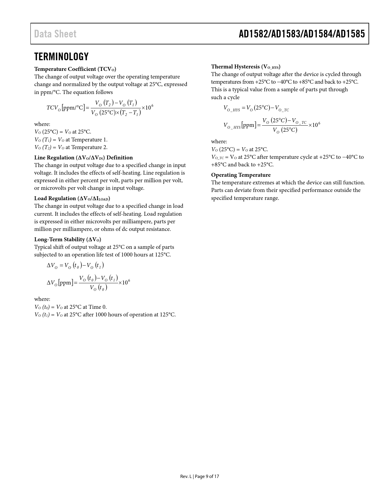 Data Sheet AD1582/AD1583/AD1584/AD1585 TERMINOLOGY Temperature Coefficient (TCV Thermal Hysteresis (VO_HYS)