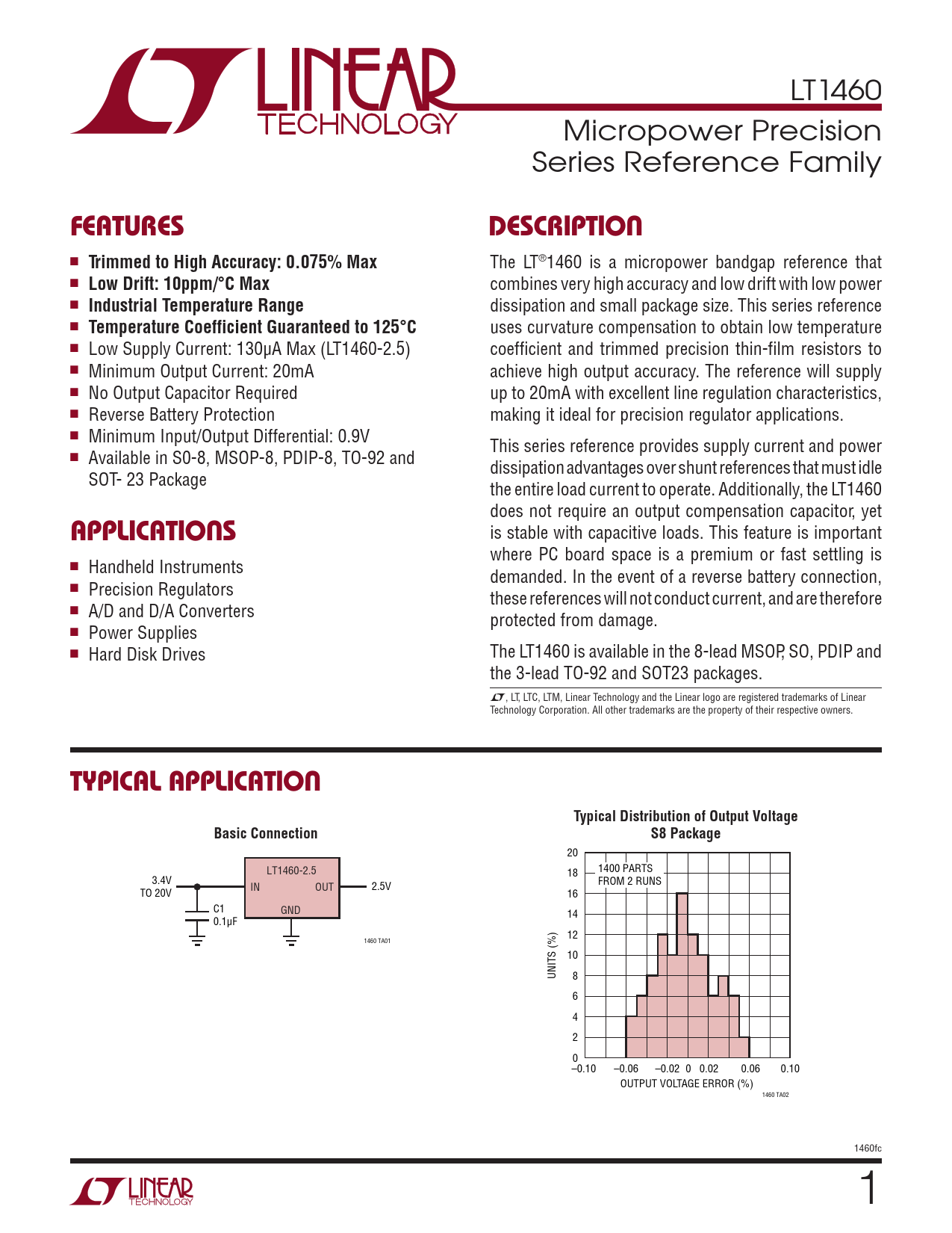 LT1460 Micropower Precision Series Reference Family Features Description n Trimmed to High Accuracy: 0.075% Max The LT®1460 is a micropower bandgap reference that n Low Drift: 10ppm/°C Max combines very high accuracy and low drift with low power n Industrial Temperature Range dissipation and small package size. This series reference n Temperature Coefficient Guaranteed to 125°C uses curvature compensation to obtain low temperature n Low Supply Current: 130µA Max (LT1460-2.5) coefficient and trimmed precision thin-film resistors to n Minimum Output Current: 20mA achieve high output accuracy. The reference will supply n No Output Capacitor Required up to 20mA with excellent line regulation characteristics, n Reverse Battery Protection making it ideal for precision regulator applications. n Minimum Input/Output Differential: 0.9V This series reference provides supply current and power n Available in S0-8, MSOP-8, PDIP-8, TO-92 and dissipation advantages over shunt references that must idle SOT- 23 Package the entire load current to operate. Additionally, the LT1460 does not require an output compensation capacitor, yet applications is stable with capacitive loads. This feature is important where PC board space is a premium or fast settling is n Handheld Instruments demanded. In the event of a reverse battery connection, n Precision Regulators these references wil not conduct current, and are therefore n A/D and D/A Converters protected from damage. n Power Supplies n Hard Disk Drives The LT1460 is available in the 8-lead MSOP, SO, PDIP and the 3-lead TO-92 and SOT23 packages. L, LT, LTC, LTM, Linear Technology and the Linear logo are registered trademarks of Linear Technology Corporation. All other trademarks are the property of their respective owners. typical application Typical Distribution of Output VoltageBasic ConnectionS8 Package 20 LT1460-2.5 18 1400 PARTS 3.4V FROM 2 RUNS IN OUT 2.5V TO 20V 16 C1 GND 14 0.1µF 12 1460 TA01 10 UNITS (%) 8 6 4 2 0–0.10 –0.06 –0.02 0 0.02 0.06 0.10 OUTPUT VOLTAGE ERROR (%) 1460 TA02 1460fc Document Outline Features Applications Description Typical Application Absolute Maximum Ratings Pin Configuration Order Information Available Options Electrical Characteristics Typical Performance Characteristics Applications Information Simplified Schematic Package Description Revision History Typical Applications Related Parts