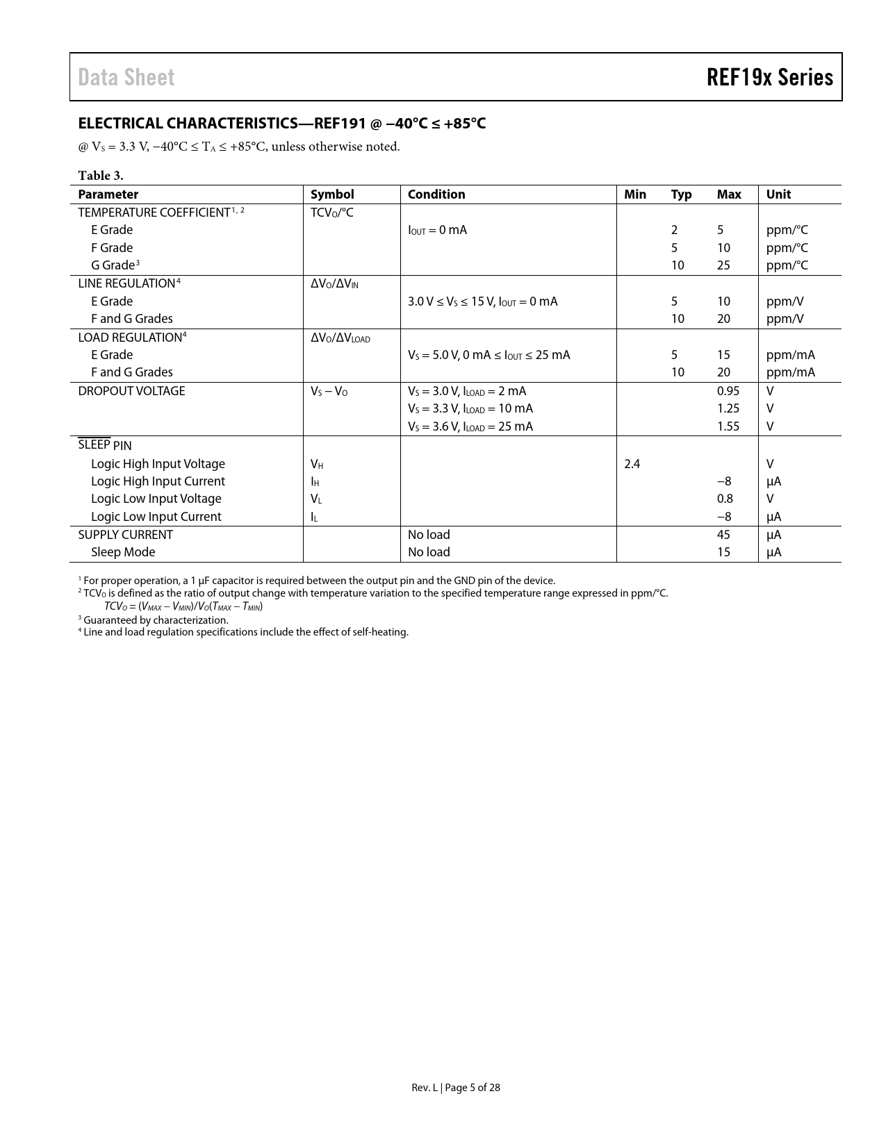 link to page 5 link to page 5 link to page 5 link to page 5 link to page 5 Data SheetREF19x SeriesELECTRICAL CHARACTERISTICS—REF191 @ −40°C ≤ +85°C @ VS = 3.3 V, −40°C ≤ TA ≤ +85°C, unless otherwise noted. Table 3. Parameter SymbolConditionMinTypMaxUnit TEMPERATURE COEFFICIENT1, 2 TCVO/°C E Grade IOUT = 0 mA 2 5 ppm/°C F Grade 5 10 ppm/°C G Grade3 10 25 ppm/°C LINE REGULATION4 ΔVO/ΔVIN E Grade 3.0 V ≤ VS ≤ 15 V, IOUT = 0 mA 5 10 ppm/V F and G Grades 10 20 ppm/V LOAD REGULATION4 ΔVO/ΔVLOAD E Grade VS = 5.0 V, 0 mA ≤ IOUT ≤ 25 mA 5 15 ppm/mA F and G Grades 10 20 ppm/mA DROPOUT VOLTAGE VS − VO VS = 3.0 V, ILOAD = 2 mA 0.95 V VS = 3.3 V, ILOAD = 10 mA 1.25 V VS = 3.6 V, ILOAD = 25 mA 1.55 V SLEEP PIN Logic High Input Voltage VH 2.4 V Logic High Input Current IH −8 μA Logic Low Input Voltage VL 0.8 V Logic Low Input Current IL −8 μA SUPPLY CURRENT No load 45 μA Sleep Mode No load 15 μA 1 For proper operation, a 1 μF capacitor is required between the output pin and the GND pin of the device. 2 TCVO is defined as the ratio of output change with temperature variation to the specified temperature range expressed in ppm/°C. TCVO = (VMAX − VMIN)/VO(TMAX − TMIN) 3 Guaranteed by characterization. 4 Line and load regulation specifications include the effect of self-heating. Rev. L | Page 5 of 28 Document Outline FEATURES APPLICATIONS GENERAL DESCRIPTION TEST PINS TABLE OF CONTENTS REVISION HISTORY SPECIFICATIONS ELECTRICAL CHARACTERISTICS—REF191 @ TA = 25°C ELECTRICAL CHARACTERISTICS—REF191 @ −40°C ≤ +85°C ELECTRICAL CHARACTERISTICS—REF191 @ −40°C ≤ TA ≤ +125°C ELECTRICAL CHARACTERISTICS—REF192 @ TA = 25°C ELECTRICAL CHARACTERISTICS—REF192 @ −40°C ≤ TA ≤ +85°C ELECTRICAL CHARACTERISTICS—REF192 @ −40°C ≤ TA ≤ +125°C ELECTRICAL CHARACTERISTICS—REF193 @ TA = 25°C ELECTRICAL CHARACTERISTICS—REF193 @ −40°C ≤ TA ≤ +85°C ELECTRICAL CHARACTERISTICS—REF193 @ TA ≤ −40°C ≤ +125°C ELECTRICAL CHARACTERISTICS—REF194 @ TA = 25°C ELECTRICAL CHARACTERISTICS—REF194 @ −40°C ≤ TA ≤ +85°C ELECTRICAL CHARACTERISTICS—REF194 @ −40°C ≤ TA ≤ +125°C ELECTRICAL CHARACTERISTICS—REF195 @ TA = 25°C ELECTRICAL CHARACTERISTICS—REF195 @ −40°C ≤ TA ≤ +85°C ELECTRICAL CHARACTERISTICS—REF195 @ −40°C ≤ TA ≤ +125°C ELECTRICAL CHARACTERISTICS—REF196 @ TA = 25°C ELECTRICAL CHARACTERISTICS—REF196 @ −40°C ≤ TA ≤ +85°C ELECTRICAL CHARACTERISTICS—REF196 @ −40°C ≤ TA ≤ +125°C ELECTRICAL CHARACTERISTICS—REF198 @ TA = 25°C ELECTRICAL CHARACTERISTICS—REF198 @ −40°C ≤ TA ≤ +85°C ELECTRICAL CHARACTERISTICS—REF198 @ −40°C ≤ TA ≤ 125°C ABSOLUTE MAXIMUM RATINGS THERMAL RESISTANCE ESD CAUTION TYPICAL PERFORMANCE CHARACTERISTICS APPLICATIONS INFORMATION OUTPUT SHORT-CIRCUIT BEHAVIOR DEVICE POWER DISSIPATION CONSIDERATIONS OUTPUT VOLTAGE BYPASSING SLEEP MODE OPERATION BASIC VOLTAGE REFERENCE CONNECTIONS MEMBRANE SWITCH-CONTROLLED POWER SUPPLY SOLDER HEAT EFFECT CURRENT-BOOSTED REFERENCES WITH CURRENT LIMITING NEGATIVE PRECISION REFERENCE WITHOUT PRECISION RESISTORS STACKING REFERENCE ICs FOR ARBITRARY OUTPUTS PRECISION CURRENT SOURCE SWITCHED OUTPUT 5 V/3.3 V REFERENCE KELVIN CONNECTIONS FAIL-SAFE 5 V REFERENCE LOW POWER, STRAIN GAGE CIRCUIT OUTLINE DIMENSIONS ORDERING GUIDE