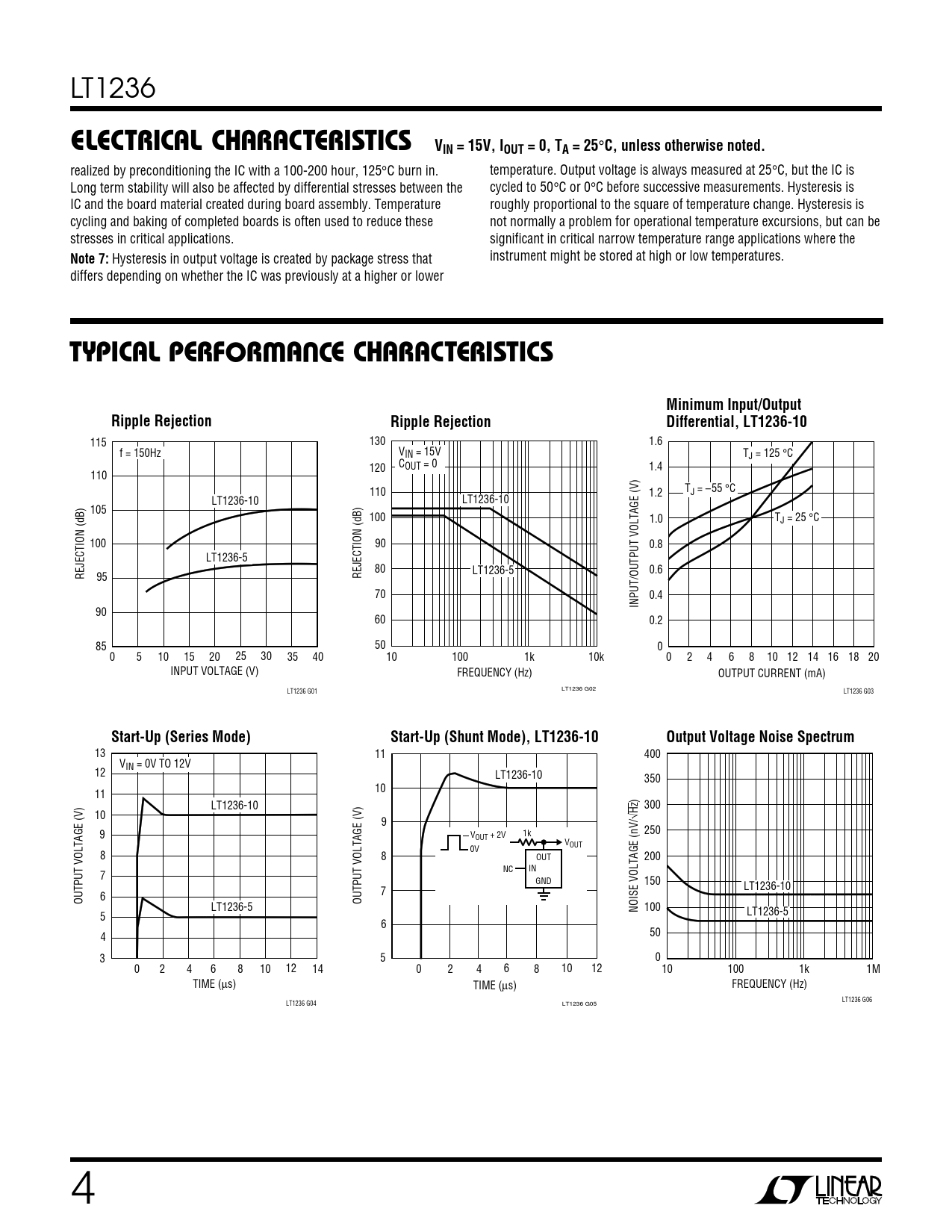 LT1236 ELECTRICAL CHAR CA TERISTICS VIN = 15V, IOUT = 0, TA = 25 ° C, unless otherwise noted. realized by preconditioning the IC with a 100-200 hour, 125°C burn in. temperature. Output voltage is always measured at 25°C, but the IC is Long term stability will also be affected by differential stresses between the cycled to 50°C or 0°C before successive measurements. Hysteresis is IC and the board material created during board assembly. Temperature roughly proportional to the square of temperature change. Hysteresis is cycling and baking of completed boards is often used to reduce these not normally a problem for operational temperature excursions, but can be stresses in critical applications. significant in critical narrow temperature range applications where the Note 7: Hysteresis in output voltage is created by package stress that instrument might be stored at high or low temperatures. differs depending on whether the IC was previously at a higher or lower WUTYPICAL PERFOR A CE CHAR CA TERISTICSMinimum Input/OutputRipple RejectionRipple RejectionDifferential, LT1236-10 115 130 1.6 f = 150Hz VIN = 15V TJ = 125 °C 120 COUT = 0 1.4 110 110 1.2 TJ = –55 °C LT1236-10 LT1236-10 105 100 1.0 TJ = 25 °C 100 90 0.8 LT1236-5 80 LT1236-5 0.6 REJECTION (dB) 95 REJECTION (dB) 70 0.4 INPUT/OUTPUT VOLTAGE (V) 90 60 0.2 85 50 0 0 5 10 15 20 25 30 35 40 10 100 1k 10k 0 2 4 6 8 10 12 14 16 18 20 INPUT VOLTAGE (V) FREQUENCY (Hz) OUTPUT CURRENT (mA) LT1236 G01 LT1236 G02 LT1236 G03 Start-Up (Series Mode)Start-Up (Shunt Mode), LT1236-10Output Voltage Noise Spectrum 13 11 400 VIN = 0V TO 12V 12 LT1236-10 350 10 11 LT1236-10 300 10 √Hz) 9 9 1k 250 VOUT + 2V VOUT 0V 8 8 OUT 200 NC IN 7 GND 150 LT1236-10 7 OUTPUT VOLTAGE (V) 6 OUTPUT VOLTAGE (V) LT1236-5 NOISE VOLTAGE (nV/ 100 LT1236-5 5 6 4 50 3 5 0 0 2 4 6 8 10 12 14 0 2 4 6 8 10 12 10 100 1k 1M TIME (µs) TIME (µs) FREQUENCY (Hz) LT1236 G06 LT1236 G04 LT1236 G05 4