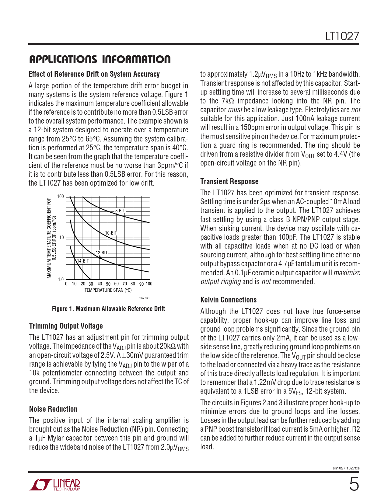 LT1027 OUUWUAPPLICATIS I FOR ATIOEffect of Reference Drift on System Accuracy to approximately 1.2µVRMS in a 10Hz to 1kHz bandwidth. Transient response is not affected by this capacitor. Start- A large portion of the temperature drift error budget in up settling time will increase to several milliseconds due many systems is the system reference voltage. Figure 1 to the 7kΩ impedance looking into the NR pin. The indicates the maximum temperature coefficient allowable capacitor must be a low leakage type. Electrolytics are not if the reference is to contribute no more than 0.5LSB error suitable for this application. Just 100nA leakage current to the overall system performance. The example shown is will result in a 150ppm error in output voltage. This pin is a 12-bit system designed to operate over a temperature the most sensitive pin on the device. For maximum protec- range from 25°C to 65°C. Assuming the system calibra- tion a guard ring is recommended. The ring should be tion is performed at 25°C, the temperature span is 40°C. driven from a resistive divider from V It can be seen from the graph that the temperature coeffi- OUT set to 4.4V (the open-circuit voltage on the NR pin). cient of the reference must be no worse than 3ppm/°C if it is to contribute less than 0.5LSB error. For this reason, Transient Response the LT1027 has been optimized for low drift. The LT1027 has been optimized for transient response. 100 Settling time is under 2µs when an AC-coupled 10mA load 8-BIT transient is applied to the output. The LT1027 achieves °C) fast settling by using a class B NPN/PNP output stage. When sinking current, the device may oscillate with ca- 10-BIT 10 pacitive loads greater than 100pF. The LT1027 is stable with all capacitive loads when at no DC load or when 12-BIT sourcing current, although for best settling time either no 0.5LSB ERROR (ppm/ 14-BIT output bypass capactor or a 4.7µF tantalum unit is recom- mended. An 0.1µF ceramic output capacitor will maximize MAXIMUM TEMPERATURE COEFFICIENT FOR 1.0 0 10 20 40 50 60 70 80 90 100 output ringing and is not recommended. 30 TEMPERATURE SPAN (°C) 1027 AI01 Kelvin ConnectionsFigure 1. Maximum Allowable Reference Drift Although the LT1027 does not have true force-sense capability, proper hook-up can improve line loss and Trimming Output Voltage ground loop problems significantly. Since the ground pin The LT1027 has an adjustment pin for trimming output of the LT1027 carries only 2mA, it can be used as a low- voltage. The impedance of the VADJ pin is about 20kΩ with side sense line, greatly reducing ground loop problems on an open-circuit voltage of 2.5V. A ±30mV guaranteed trim the low side of the reference. The VOUT pin should be close range is achievable by tying the VADJ pin to the wiper of a to the load or connected via a heavy trace as the resistance 10k potentiometer connecting between the output and of this trace directly affects load regulation. It is important ground. Trimming output voltage does not affect the TC of to remember that a 1.22mV drop due to trace resistance is the device. equivalent to a 1LSB error in a 5VFS, 12-bit system. The circuits in Figures 2 and 3 illustrate proper hook-up to Noise Reduction minimize errors due to ground loops and line losses. The positive input of the internal scaling amplifier is Losses in the output lead can be further reduced by adding brought out as the Noise Reduction (NR) pin. Connecting a PNP boost transistor if load current is 5mA or higher. R2 a 1µF Mylar capacitor between this pin and ground will can be added to further reduce current in the output sense reduce the wideband noise of the LT1027 from 2.0µV load. RMS sn1027 1027fcs 5