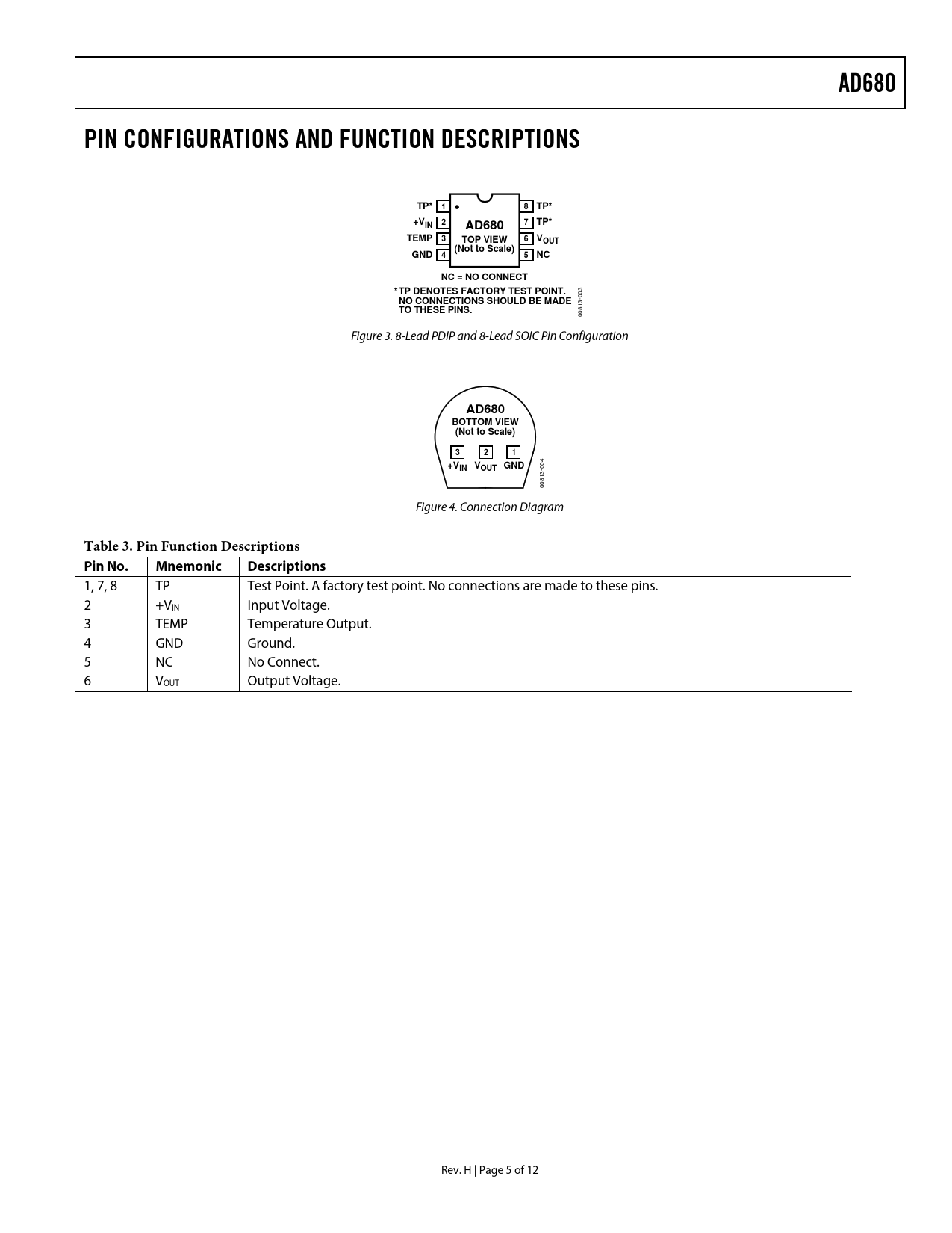 AD680PIN CONFIGURATIONS AND FUNCTION DESCRIPTIONSTP*18TP*+VIN 2AD6807TP*TEMP3TOP VIEW6VOUT(Not to Scale)GND45NCNC = NO CONNECT* TP DENOTES FACTORY TEST POINT.NO CONNECTIONS SHOULD BE MADE TO THESE PINS. 00813-003 Figure 3. 8-Lead PDIP and 8-Lead SOIC Pin Configuration AD680BOTTOM VIEW(Not to Scale)321+VIN VOUT GND 00813-004 Figure 4. Connection Diagram Table 3. Pin Function Descriptions Pin No.MnemonicDescriptions 1, 7, 8 TP Test Point. A factory test point. No connections are made to these pins. 2 +VIN Input Voltage. 3 TEMP Temperature Output. 4 GND Ground. 5 NC No Connect. 6 VOUT Output Voltage. Rev. H | Page 5 of 12 Document Outline FEATURES GENERAL DESCRIPTION CONNECTION DIAGRAMS PRODUCT HIGHLIGHTS SPECIFICATIONS ABSOLUTE MAXIMUM RATINGS OUTPUT PROTECTION ESD CAUTION PIN CONFIGURATIONS AND FUNCTION DESCRIPTIONS THEORY OF OPERATION APPLYING THE AD680 NOISE PERFORMANCE TURN-ON TIME DYNAMIC PERFORMANCE LOAD REGULATION TEMPERATURE PERFORMANCE TEMPERATURE OUTPUT PIN DIFFERENTIAL TEMPERATURE TRANSDUCER LOW POWER, LOW VOLTAGE REFERENCE FOR DATA CONVERTERS 4.5 V REFERENCE FROM A 5 V SUPPLY VOLTAGE REGULATOR FOR PORTABLE EQUIPMENT OUTLINE DIMENSIONS ORDERING GUIDE