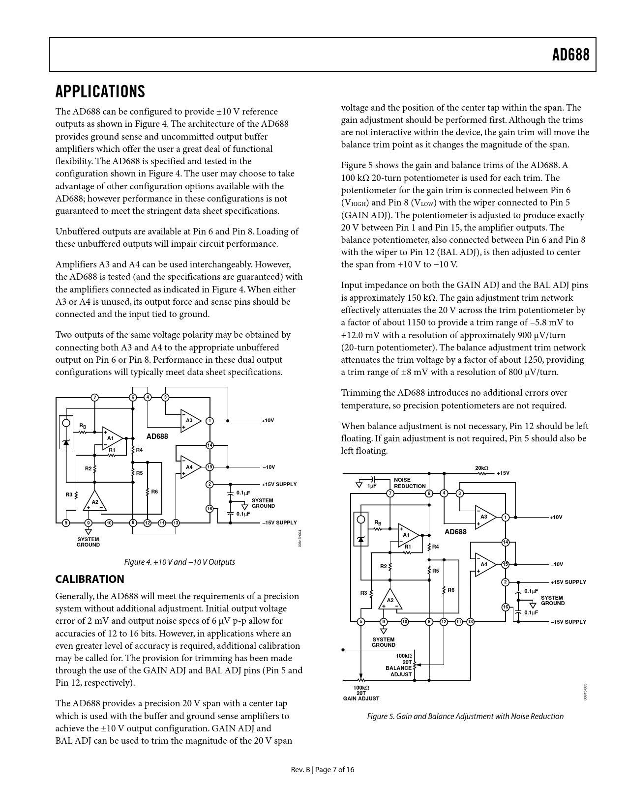 link to page 7 link to page 7 link to page 7 link to page 7 AD688APPLICATIONS The AD688 can be configured to provide ±10 V reference voltage and the position of the center tap within the span. The outputs as shown in Figure 4. The architecture of the AD688 gain adjustment should be performed first. Although the trims provides ground sense and uncommitted output buffer are not interactive within the device, the gain trim will move the amplifiers which offer the user a great deal of functional balance trim point as it changes the magnitude of the span. flexibility. The AD688 is specified and tested in the Figure 5 shows the gain and balance trims of the AD688. A configuration shown in Figure 4. The user may choose to take 100 kΩ 20-turn potentiometer is used for each trim. The advantage of other configuration options available with the potentiometer for the gain trim is connected between Pin 6 AD688; however performance in these configurations is not (VHIGH) and Pin 8 (VLOW) with the wiper connected to Pin 5 guaranteed to meet the stringent data sheet specifications. (GAIN ADJ). The potentiometer is adjusted to produce exactly Unbuffered outputs are available at Pin 6 and Pin 8. Loading of 20 V between Pin 1 and Pin 15, the amplifier outputs. The these unbuffered outputs will impair circuit performance. balance potentiometer, also connected between Pin 6 and Pin 8 with the wiper to Pin 12 (BAL ADJ), is then adjusted to center Amplifiers A3 and A4 can be used interchangeably. However, the span from +10 V to −10 V. the AD688 is tested (and the specifications are guaranteed) with the amplifiers connected as indicated in Figure 4. When either Input impedance on both the GAIN ADJ and the BAL ADJ pins A3 or A4 is unused, its output force and sense pins should be is approximately 150 kΩ. The gain adjustment trim network connected and the input tied to ground. effectively attenuates the 20 V across the trim potentiometer by a factor of about 1150 to provide a trim range of –5.8 mV to Two outputs of the same voltage polarity may be obtained by +12.0 mV with a resolution of approximately 900 µV/turn connecting both A3 and A4 to the appropriate unbuffered (20-turn potentiometer). The balance adjustment trim network output on Pin 6 or Pin 8. Performance in these dual output attenuates the trim voltage by a factor of about 1250, providing configurations will typically meet data sheet specifications. a trim range of ±8 mV with a resolution of 800 µV/turn. Trimming the AD688 introduces no additional errors over 7643 temperature, so precision potentiometers are not required. A31+10VRB When balance adjustment is not necessary, Pin 12 should be left A1AD688 floating. If gain adjustment is not required, Pin 5 should also be 14R1R4 left floating. R2A415–10V20k Ω R5+15VNOISE2+15V SUPPLY1 µ FREDUCTIONR6R30.1 µ F7643A2SYSTEM GROUND160.1 µ FA31+10V59108121113–15V SUPPLYRBAD688 004 A1SYSTEM14GROUND 00815- R1R4 Figure 4. +10 V and −10 V Outputs R2A415–10VR5CALIBRATION2+15V SUPPLYR60.1 µ F Generally, the AD688 will meet the requirements of a precision R3A2SYSTEM GROUND system without additional adjustment. Initial output voltage 160.1 µ F error of 2 mV and output noise specs of 6 µV p-p allow for 59108121113–15V SUPPLY accuracies of 12 to 16 bits. However, in applications where an SYSTEM even greater level of accuracy is required, additional calibration GROUND may be called for. The provision for trimming has been made 100k Ω 20T through the use of the GAIN ADJ and BAL ADJ pins (Pin 5 and BALANCEADJUST Pin 12, respectively). 100k Ω 20TGAIN ADJUST The AD688 provides a precision 20 V span with a center tap 00815-005 which is used with the buffer and ground sense amplifiers to Figure 5. Gain and Balance Adjustment with Noise Reduction achieve the ±10 V output configuration. GAIN ADJ and BAL ADJ can be used to trim the magnitude of the 20 V span Rev. B | Page 7 of 16 Document Outline FEATURES GENERAL DESCRIPTION FUNCTIONAL BLOCK DIAGRAM PRODUCT HIGHLIGHTS SPECIFICATIONS ABSOLUTE MAXIMUM RATINGS ESD CAUTION PIN CONFIGURATION AND FUNCTION DESCRIPTIONS THEORY OF OPERATION APPLICATIONS CALIBRATION NOISE PERFORMANCE AND REDUCTION TURN ON TIME TEMPERATURE PERFORMANCE KELVIN CONNECTIONS DYNAMIC PERFORMANCE BRIDGE DRIVER CIRCUIT OUTLINE DIMENSIONS ORDERING GUIDE