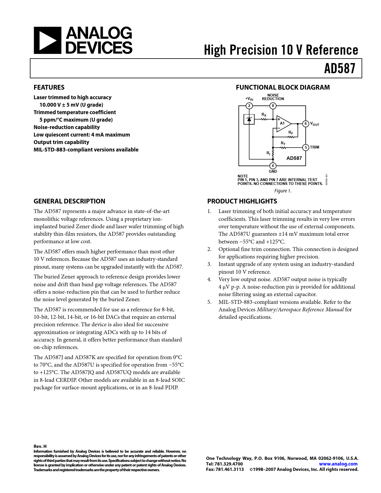 | Pages / Page | 12 / 1 — High Precision 10 V Reference. AD587. FEATURES. FUNCTIONAL BLOCK DIAGRAM. … |