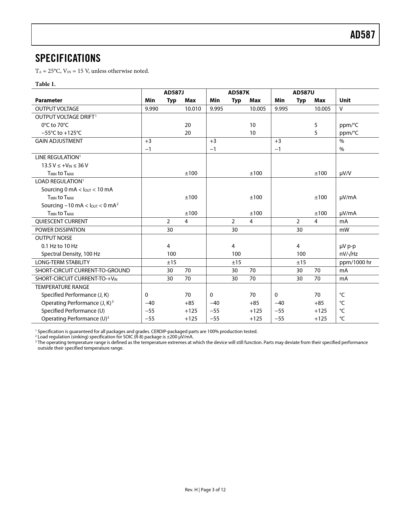 Pages / Page12 / 3 — AD587. SPECIFICATIONS. Table 1. AD587J. AD587K. AD587U. Parameter. Min …