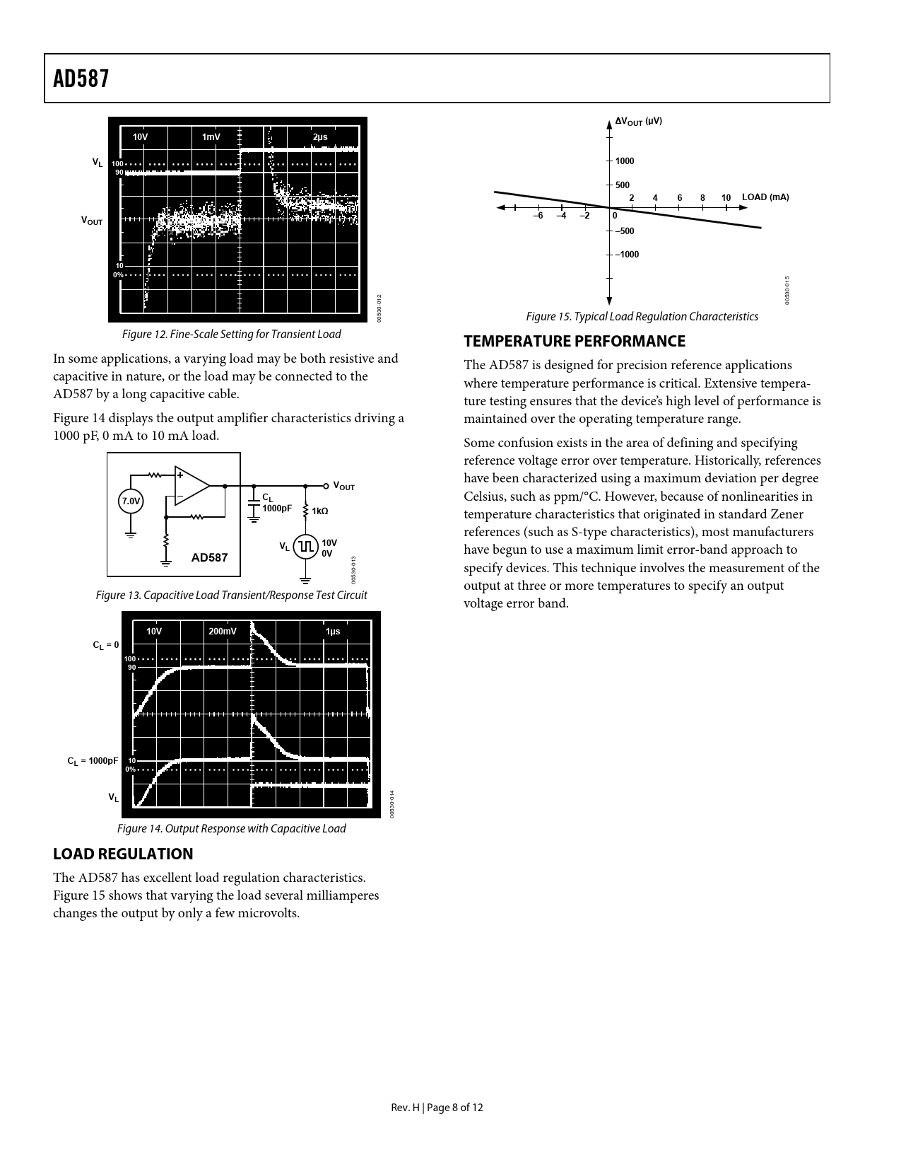 AD587. ΔVOUT (µV). 10V. 1mV. 2µs. VL 100. 1000. 500. LOAD (mA). OUT. –500. –1000. TEMPERATURE PERFORMANCE. VOUT. 7.0V. 1000pF. 1kΩ. 200mV. 1µs. CL = 0. 100
