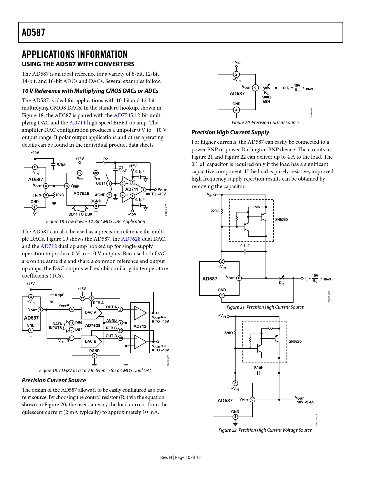 output range. Bipolar output applications and other operating details can be found in the individual product data sheets. For higher currents, the AD587 can easily be connected to a power PNP or power Darlington PNP device. The circuits in