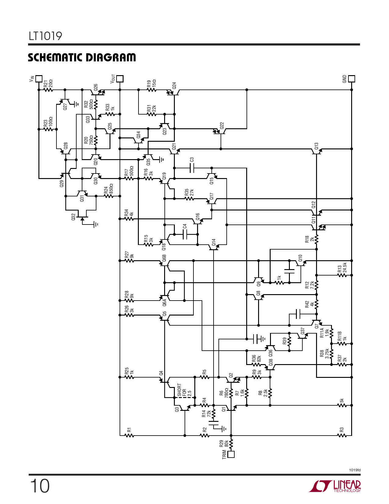 INV Ω OUTV Ω GND R21 20 R19 15 Q24 Q26 Ω R32 500 Q27 R33 1k R31 22k Ω Q33 R23 100 Q25 Q22 Q23 Ω Q34 R20 750 Q28 Q21 Q13 C3 Q20 Q35 Ω R17 500 R16 3k Q19 Q30 Q15 Q29 Ω R24 850 R35 27k Q17 Q31 Q12 R34 4k Q32 Q16 Q11 C4 R15 3k R18 2k Q14 Q18 R27 9k Q6B Q10 R13 24.5k 1k Q9 R12 7.2k Q8 R28 9k Q6A R42 4k R26 3k Q5 Q7 Q37 R11A 1.9k R11B 1k R39 Q36 R38 3.75k R36 82k R37 2k Q38 R25 1k Q4 R5 R9 3k Q2 Ω SHORT FOR 2.5 R6 R7 1.6k R8 2.5k 780 R4 5k Q3 Q1 R14 72k R1 R2 R3 R29 80k TRIM 1019fd 10