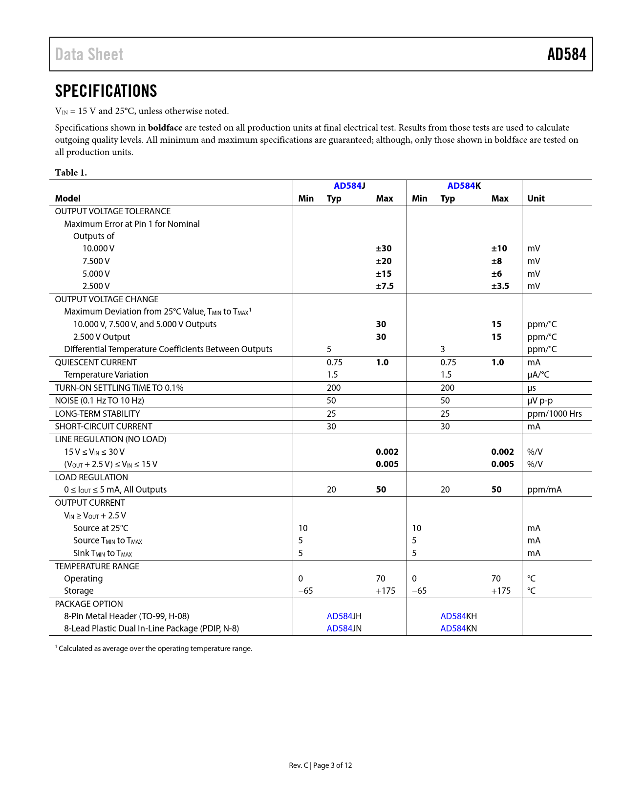Pages / Page12 / 3 — Data Sheet. AD584. SPECIFICATIONS. boldface. Table 1. AD584J. AD584K. …