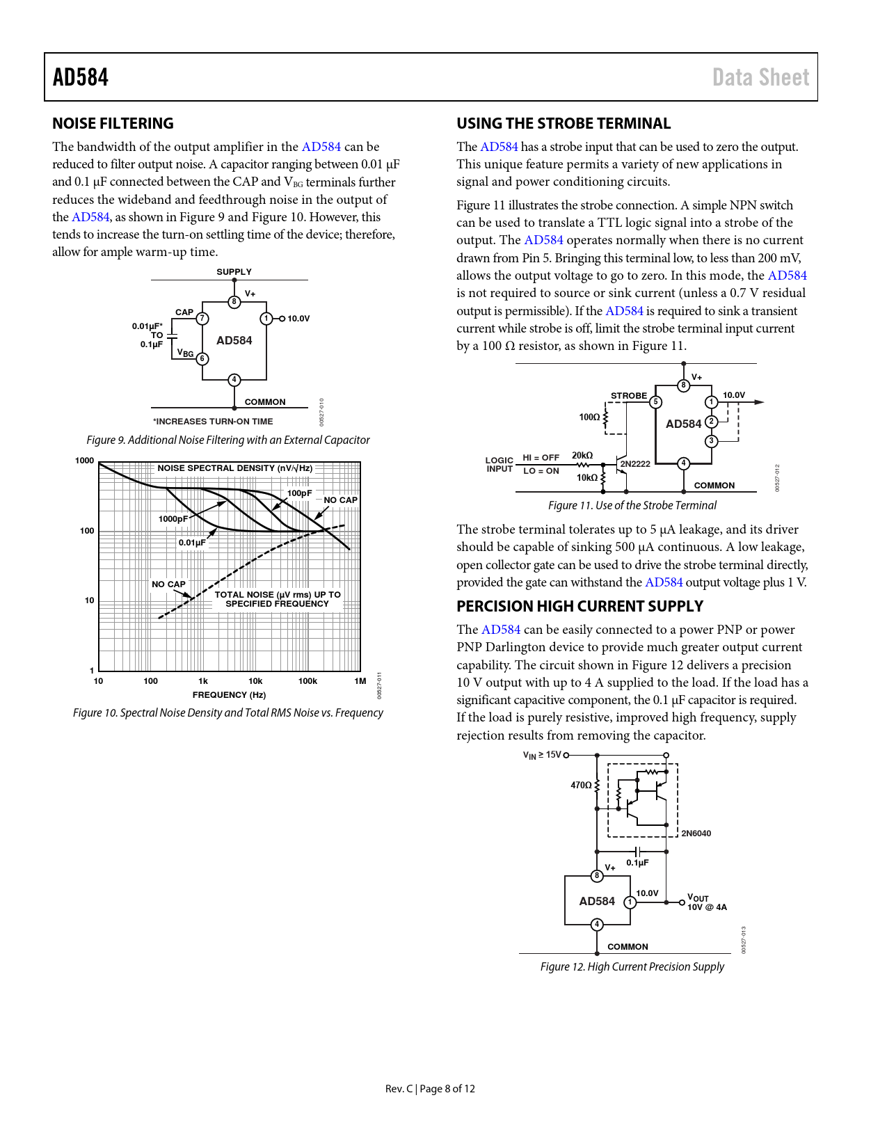 link to page 8 link to page 8 link to page 8 link to page 8 link to page 8 AD584Data SheetNOISE FILTERINGUSING THE STROBE TERMINAL The bandwidth of the output amplifier in the AD584 can be The AD584 has a strobe input that can be used to zero the output. reduced to filter output noise. A capacitor ranging between 0.01 µF This unique feature permits a variety of new applications in and 0.1 µF connected between the CAP and VBG terminals further signal and power conditioning circuits. reduces the wideband and feedthrough noise in the output of Figure 11 il ustrates the strobe connection. A simple NPN switch the AD584, as shown in Figure 9 and Figure 10. However, this can be used to translate a TTL logic signal into a strobe of the tends to increase the turn-on settling time of the device; therefore, output. The AD584 operates normally when there is no current allow for ample warm-up time. drawn from Pin 5. Bringing this terminal low, to less than 200 mV, SUPPLY allows the output voltage to go to zero. In this mode, the AD584 V+ is not required to source or sink current (unless a 0.7 V residual 8CAP output is permissible). If the AD584 is required to sink a transient 7110.0V0.01µF* current while strobe is off, limit the strobe terminal input current TOAD5840.1µFV by a 100 Ω resistor, as shown in Figure 11. BG 64V+8STROBE10.0VCOMMON51 010 100Ω*INCREASES TURN-ON TIME2 00527- AD584 Figure 9. Additional Noise Filtering with an External Capacitor 3HI = OFF20kΩ1000LOGIC42N2222NOISE SPECTRAL DENSITY (nV/ Hz)INPUTLO = ON10kΩ 012 COMMON100pF 00527- NO CAP Figure 11. Use of the Strobe Terminal 1000pF100 The strobe terminal tolerates up to 5 µA leakage, and its driver 0.01µF should be capable of sinking 500 µA continuous. A low leakage, open collector gate can be used to drive the strobe terminal directly, NO CAP provided the gate can withstand the AD584 output voltage plus 1 V. TOTAL NOISE (µV rms) UP TO10SPECIFIED FREQUENCYPERCISION HIGH CURRENT SUPPLY The AD584 can be easily connected to a power PNP or power PNP Darlington device to provide much greater output current 1 capability. The circuit shown in Figure 12 delivers a precision 1 1 101001k10k100k1M 0 10 V output with up to 4 A supplied to the load. If the load has a FREQUENCY (Hz) 00527- significant capacitive component, the 0.1 µF capacitor is required. Figure 10. Spectral Noise Density and Total RMS Noise vs. Frequency If the load is purely resistive, improved high frequency, supply rejection results from removing the capacitor. VIN ≥ 15V470Ω2N60400.1µFV+810.0VAD584V1OUT10V @ 4A4 013 COMMON 00527- Figure 12. High Current Precision Supply Rev. C | Page 8 of 12 Document Outline Features General Description Pin Configurations Product Highlights Table of Contents Revision History Specifications Absolute Maximum Ratings ESD Caution Theory of Operation Applying the AD584 Performance over Temperature Output Current Characteristics Dynamic Performance Noise Filtering Using the Strobe Terminal Percision High Current Supply The AD584 as a Current Limiter Negative Reference Voltages from an AD584 10 V Reference with Multiplying CMOS DACs or ADCs Precision DAC Reference Outline Dimensions Ordering Guide