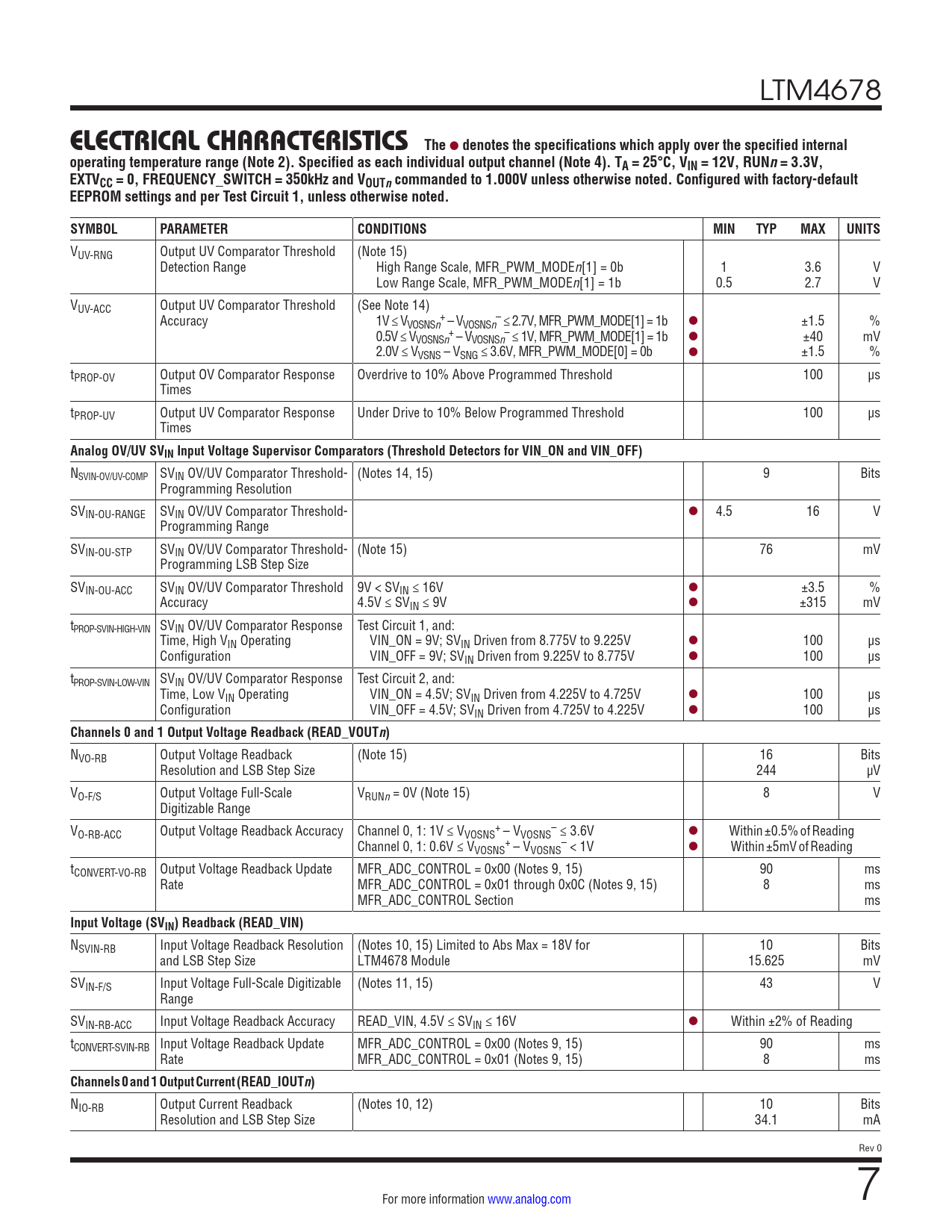 link to page 115 LTM4678 ELECTRICAL CHARACTERISTICSThe l denotes the specifications which apply over the specified internaloperating temperature range (Note 2). Specified as each individual output channel (Note 4). TA = 25°C, VIN = 12V, RUNn= 3.3V,EXTVCC = 0, FREQUENCY_SWITCH = 350kHz and VOUTncommanded to 1.000V unless otherwise noted. Configured with factory-defaultEEPROM settings and per Test Circuit 1, unless otherwise noted.SYMBOLPARAMETERCONDITIONSMINTYPMAXUNITS VUV-RNG Output UV Comparator Threshold (Note 15) Detection Range High Range Scale, MFR_PWM_MODEn[1] = 0b 1 3.6 V Low Range Scale, MFR_PWM_MODEn[1] = 1b 0.5 2.7 V VUV-ACC Output UV Comparator Threshold (See Note 14) Accuracy 1V ≤ V + – VOSNSn – VVOSNSn ≤ 2.7V, MFR_PWM_MODE[1] = 1b l ±1.5 % 0.5V ≤ V + – VOSNSn – VVOSNSn ≤ 1V, MFR_PWM_MODE[1] = 1b l ±40 mV 2.0V ≤ VVSNS – VSNG ≤ 3.6V, MFR_PWM_MODE[0] = 0b l ±1.5 % tPROP-OV Output OV Comparator Response Overdrive to 10% Above Programmed Threshold 100 µs Times tPROP-UV Output UV Comparator Response Under Drive to 10% Below Programmed Threshold 100 µs Times Analog OV/UV SVIN Input Voltage Supervisor Comparators (Threshold Detectors for VIN_ON and VIN_OFF) NSVIN-OV/UV-COMP SVIN OV/UV Comparator Threshold- (Notes 14, 15) 9 Bits Programming Resolution SVIN-OU-RANGE SVIN OV/UV Comparator Threshold- l 4.5 16 V Programming Range SVIN-OU-STP SVIN OV/UV Comparator Threshold- (Note 15) 76 mV Programming LSB Step Size SVIN-OU-ACC SVIN OV/UV Comparator Threshold 9V < SVIN ≤ 16V l ±3.5 % Accuracy 4.5V ≤ SVIN ≤ 9V l ±315 mV tPROP-SVIN-HIGH-VIN SVIN OV/UV Comparator Response Test Circuit 1, and: Time, High VIN Operating VIN_ON = 9V; SVIN Driven from 8.775V to 9.225V l 100 µs Configuration VIN_OFF = 9V; SVIN Driven from 9.225V to 8.775V l 100 µs tPROP-SVIN-LOW-VIN SVIN OV/UV Comparator Response Test Circuit 2, and: Time, Low VIN Operating VIN_ON = 4.5V; SVIN Driven from 4.225V to 4.725V l 100 µs Configuration VIN_OFF = 4.5V; SVIN Driven from 4.725V to 4.225V l 100 µs Channels 0 and 1 Output Voltage Readback (READ_VOUTn) NVO-RB Output Voltage Readback (Note 15) 16 Bits Resolution and LSB Step Size 244 µV VO-F/S Output Voltage Full-Scale VRUNn = 0V (Note 15) 8 V Digitizable Range V + – O-RB-ACC Output Voltage Readback Accuracy Channel 0, 1: 1V ≤ VVOSNS – VVOSNS ≤ 3.6V l Within ±0.5% of Reading Channel 0, 1: 0.6V ≤ V + – VOSNS – VVOSNS < 1V l Within ±5mV of Reading tCONVERT-VO-RB Output Voltage Readback Update MFR_ADC_CONTROL = 0x00 (Notes 9, 15) 90 ms Rate MFR_ADC_CONTROL = 0x01 through 0x0C (Notes 9, 15) 8 ms MFR_ADC_CONTROL Section ms Input Voltage (SVIN) Readback (READ_VIN) NSVIN-RB Input Voltage Readback Resolution (Notes 10, 15) Limited to Abs Max = 18V for 10 Bits and LSB Step Size LTM4678 Module 15.625 mV SVIN-F/S Input Voltage Full-Scale Digitizable (Notes 11, 15) 43 V Range SVIN-RB-ACC Input Voltage Readback Accuracy READ_VIN, 4.5V ≤ SVIN ≤ 16V l Within ±2% of Reading tCONVERT-SVIN-RB Input Voltage Readback Update MFR_ADC_CONTROL = 0x00 (Notes 9, 15) 90 ms Rate MFR_ADC_CONTROL = 0x01 (Notes 9, 15) 8 ms Channels 0 and 1 Output Current (READ_IOUTn) NIO-RB Output Current Readback (Notes 10, 12) 10 Bits Resolution and LSB Step Size 34.1 mA Rev 0 For more information www.analog.com 7 Document Outline Functional Diagram Features Applications Typical Application Description Table of Contents Absolute Maximum Ratings Order Information Pin Configuration Electrical Characteristics Typical Performance Characteristics Pin Functions Simplified Block Diagram Decoupling Requirements Functional Diagram Test Circuits Operation Power Module Introduction Power Module Overview, Major Features EEPROM with ECC Power-Up and Initialization Soft-Start Time-Based Sequencing Voltage-Based Sequencing Shutdown Light-Load Current Operation Switching Frequency and Phase PWM Loop Compensation Output Voltage Sensing INTVCC/EXTVCC Power Output Current Sensing and Sub Milliohm DCR Current Sensing Input Current Sensing PolyPhase Load Sharing External/Internal Temperature Sense RCONFIG (Resistor Configuration) Pins Table 1. VOUTn _CFG Pin Strapping Look-Up Table for the LTM4678’s Output Voltage, Coarse Setting (Not Applicable if MFR_CONFIG_ALL[6] = 1b) Table 2. VTRIMn_CFG Pin Strapping Look-Up Table for the LTM4678’s Output Voltage, Fine Adjustment Setting (Not Applicable if MFR_CONFIG_ALL[6] = 1b) Table 3. FSWPH_CFG Pin Strapping Look-Up Table to Set the LTM4678’s Switching Frequency and Channel Phase-Interleaving Angle (Not Applicable if MFR_CONFIG_ALL[6] = 1b) Table 4. ASEL Pin Strapping Look-Up Table to Set the LTM4678’s Slave Address (Applicable Regardless of MFR_CONFIG_ALL[6] Setting) Table 5. LTM4678 MFR_ADDRESS Command Examples Expressed in 7- and 8-Bit Addressing Fault Detection and Handling Status Registers and ALERT Masking Figure 5. LTM4678 Status Register Summary Mapping Faults to FAULT Pins Power Good Pins CRC Protection Serial Interface Communication Protection Device Addressing Responses to VOUT and IIN/IOUT Faults Output Overvoltage Fault Response Output Undervoltage Response Peak Output Overcurrent Fault Response Responses to Timing Faults Responses to VIN OV Faults Responses to OT/UT Faults Internal Overtemperature Fault Response External Overtemperature and Undertemperature Fault Response Responses to Input Overcurrent and Output Undercurrent Faults Responses to External Faults Fault Logging Bus Timeout Protection Similarity Between PMBus, SMBus and I2C 2-Wire Interface PMBus Serial Digital Interface Table 6. Abbreviations of Supported Data Formats Figure 6. PMBus Timing Diagram Figures 7 to 24 PMBus Protocols PMBus Command Summary PMBus Commands Table 7. PMBus Commands Summary (Note: The Data Format Abbreviations are Detailed in Table 8) Table 8. Data Format Abbreviations Applications Information VIN to VOUT Step-Down Ratios Input Capacitors Output Capacitors Light Load Current Operation Switching Frequency and Phase Output Current Lim