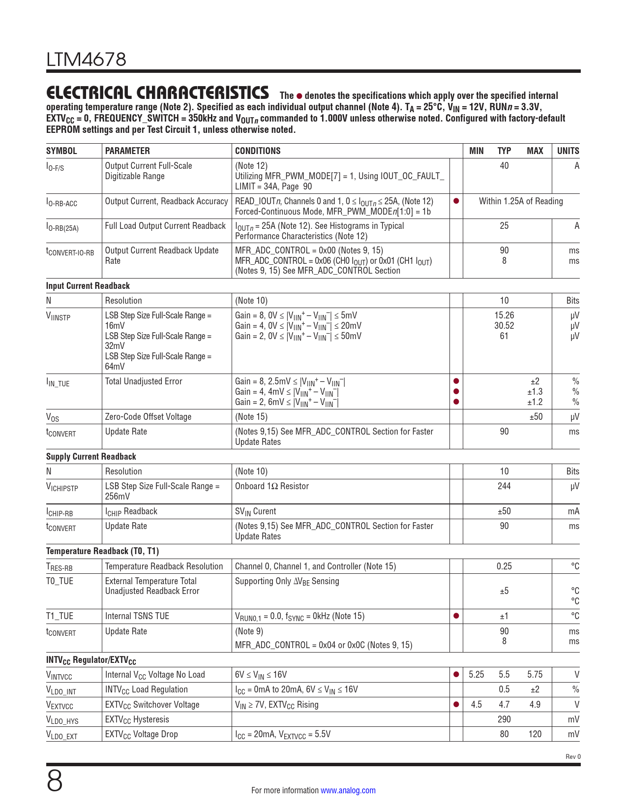 link to page 90 link to page 12 link to page 12 link to page 115 link to page 115 link to page 115 LTM4678 ELECTRICAL CHARACTERISTICSThe l denotes the specifications which apply over the specified internaloperating temperature range (Note 2). Specified as each individual output channel (Note 4). TA = 25°C, VIN = 12V, RUNn= 3.3V,EXTVCC = 0, FREQUENCY_SWITCH = 350kHz and VOUTncommanded to 1.000V unless otherwise noted. Configured with factory-defaultEEPROM settings and per Test Circuit 1, unless otherwise noted.SYMBOLPARAMETERCONDITIONSMINTYPMAXUNITS IO-F/S Output Current Full-Scale (Note 12) 40 A Digitizable Range Utilizing MFR_PWM_MODE[7] = 1, Using IOUT_OC_FAULT_ LIMIT = 34A, Page 90 IO-RB-ACC Output Current, Readback Accuracy READ_IOUTn, Channels 0 and 1, 0 ≤ IOUTn ≤ 25A, (Note 12) l Within 1.25A of Reading Forced-Continuous Mode, MFR_PWM_MODEn[1:0] = 1b IO-RB(25A) Full Load Output Current Readback IOUTn = 25A (Note 12). See Histograms in Typical 25 A Performance Characteristics (Note 12) tCONVERT-IO-RB Output Current Readback Update MFR_ADC_CONTROL = 0x00 (Notes 9, 15) 90 ms Rate MFR_ADC_CONTROL = 0x06 (CH0 IOUT) or 0x01 (CH1 IOUT) 8 ms (Notes 9, 15) See MFR_ADC_CONTROL Section Input Current Readback N Resolution (Note 10) 10 Bits V + – IINSTP LSB Step Size Full-Scale Range = Gain = 8, 0V ≤ |VIIN – VIIN | ≤ 5mV 15.26 µV 16mV Gain = 4, 0V ≤ |V + – IIN – VIIN | ≤ 20mV 30.52 µV LSB Step Size Full-Scale Range = Gain = 2, 0V ≤ |V + – IIN – VIIN | ≤ 50mV 61 µV 32mV LSB Step Size Full-Scale Range = 64mV I + – IN_TUE Total Unadjusted Error Gain = 8, 2.5mV ≤ |VIIN – VIIN | l ±2 % Gain = 4, 4mV ≤ |V + – IIN – VIIN | l ±1.3 % Gain = 2, 6mV ≤ |V + – IIN – VIIN | l ±1.2 % VOS Zero-Code Offset Voltage (Note 15) ±50 µV tCONVERT Update Rate (Notes 9,15) See MFR_ADC_CONTROL Section for Faster 90 ms Update Rates Supply Current Readback N Resolution (Note 10) 10 Bits VICHIPSTP LSB Step Size Full-Scale Range = Onboard 1Ω Resistor 244 µV 256mV ICHIP-RB ICHIP Readback SVIN Curent ±50 mA tCONVERT Update Rate (Notes 9,15) See MFR_ADC_CONTROL Section for Faster 90 ms Update Rates Temperature Readback (T0, T1) TRES-RB Temperature Readback Resolution Channel 0, Channel 1, and Controller (Note 15) 0.25 °C T0_TUE External Temperature Total Supporting Only ∆VBE Sensing Unadjusted Readback Error ±5 °C °C T1_TUE Internal TSNS TUE VRUN0,1 = 0.0, fSYNC = 0kHz (Note 15) l ±1 °C tCONVERT Update Rate (Note 9) 90 ms MFR_ADC_CONTROL = 0x04 or 0x0C (Notes 9, 15) 8 ms INTVCC Regulator/EXTVCC VINTVCC Internal VCC Voltage No Load 6V ≤ VIN ≤ 16V l 5.25 5.5 5.75 V VLDO_INT INTVCC Load Regulation ICC = 0mA to 20mA, 6V ≤ VIN ≤ 16V 0.5 ±2 % VEXTVCC EXTVCC Switchover Voltage VIN ≥ 7V, EXTVCC Rising l 4.5 4.7 4.9 V VLDO_HYS EXTVCC Hysteresis 290 mV VLDO_EXT EXTVCC Voltage Drop ICC = 20mA, VEXTVCC = 5.5V 80 120 mV Rev 0 8 For more information www.analog.com Document Outline Functional Diagram Features Applications Typical Application Description Table of Contents Absolute Maximum Ratings Order Information Pin Configuration Electrical Characteristics Typical Performance Characteristics Pin Functions Simplified Block Diagram Decoupling Requirements Functional Diagram Test Circuits Operation Power Module Introduction Power Module Overview, Major Features EEPROM with ECC Power-Up and Initialization Soft-Start Time-Based Sequencing Voltage-Based Sequencing Shutdown Light-Load Current Operation Switching Frequency and Phase PWM Loop Compensation Output Voltage Sensing INTVCC/EXTVCC Power Output Current Sensing and Sub Milliohm DCR Current Sensing Input Current Sensing PolyPhase Load Sharing External/Internal Temperature Sense RCONFIG (Resistor Configuration) Pins Table 1. VOUTn _CFG Pin Strapping Look-Up Table for the LTM4678’s Output Voltage, Coarse Setting (Not Applicable if MFR_CONFIG_ALL[6] = 1b) Table 2. VTRIMn_CFG Pin Strapping Look-Up Table for the LTM4678’s Output Voltage, Fine Adjustment Setting (Not Applicable if MFR_CONFIG_ALL[6] = 1b) Table 3. FSWPH_CFG Pin Strapping Look-Up Table to Set the LTM4678’s Switching Frequency and Channel Phase-Interleaving Angle (Not Applicable if MFR_CONFIG_ALL[6] = 1b) Table 4. ASEL Pin Strapping Look-Up Table to Set the LTM4678’s Slave Address (Applicable Regardless of MFR_CONFIG_ALL[6] Setting) Table 5. LTM4678 MFR_ADDRESS Command Examples Expressed in 7- and 8-Bit Addressing Fault Detection and Handling Status Registers and ALERT Masking Figure 5. LTM4678 Status Register Summary Mapping Faults to FAULT Pins Power Good Pins CRC Protection Serial Interface Communication Protection Device Addressing Responses to VOUT and IIN/IOUT Faults Output Overvoltage Fault Response Output Undervoltage Response Peak Output Overcurrent Fault Response Responses to Timing Faults Responses to VIN OV Faults Responses to OT/UT Faults Internal Overtemperature Fault Response External Overtemperature and Undertemperature Fault Response Responses to Input Overcurrent and Output Undercurrent Faults Responses to External Faults Fault Logging Bus Timeout Protection Similarity Between PMBus, SMBus and I2C 2-Wire Interface PMBus Serial Digital Interface Table 6. Abbreviations of Supported Data Formats Figure 6. PMBus Timing Diagram Figures 7 to 24 PMBus Protocols PMBus Command Summary PMBus Commands Table 7. PMBus Commands Summary (Note: The Data Format Abbreviations are Detailed in Table 8) Table 8. Data Format Abbreviations Applications Information VIN to VOUT Step-Down Ratios Input Capacitors Output Capacitors Light Load Current Operation Switching Frequency and Phase Output Current Limit Programming Minimum On-Time Considerations Variable Delay Time, Soft-Start and Output Voltage Ramping Digital Servo Mode Soft Off (Sequenced Off) Undervoltage Lockout Fault Detection and Handling Open-Drain Pins Phase-Locked Loop and Frequency Synchronization Input Current Sense Amplifier Programmable Loop Compensation Checking Transient Response PolyPhas