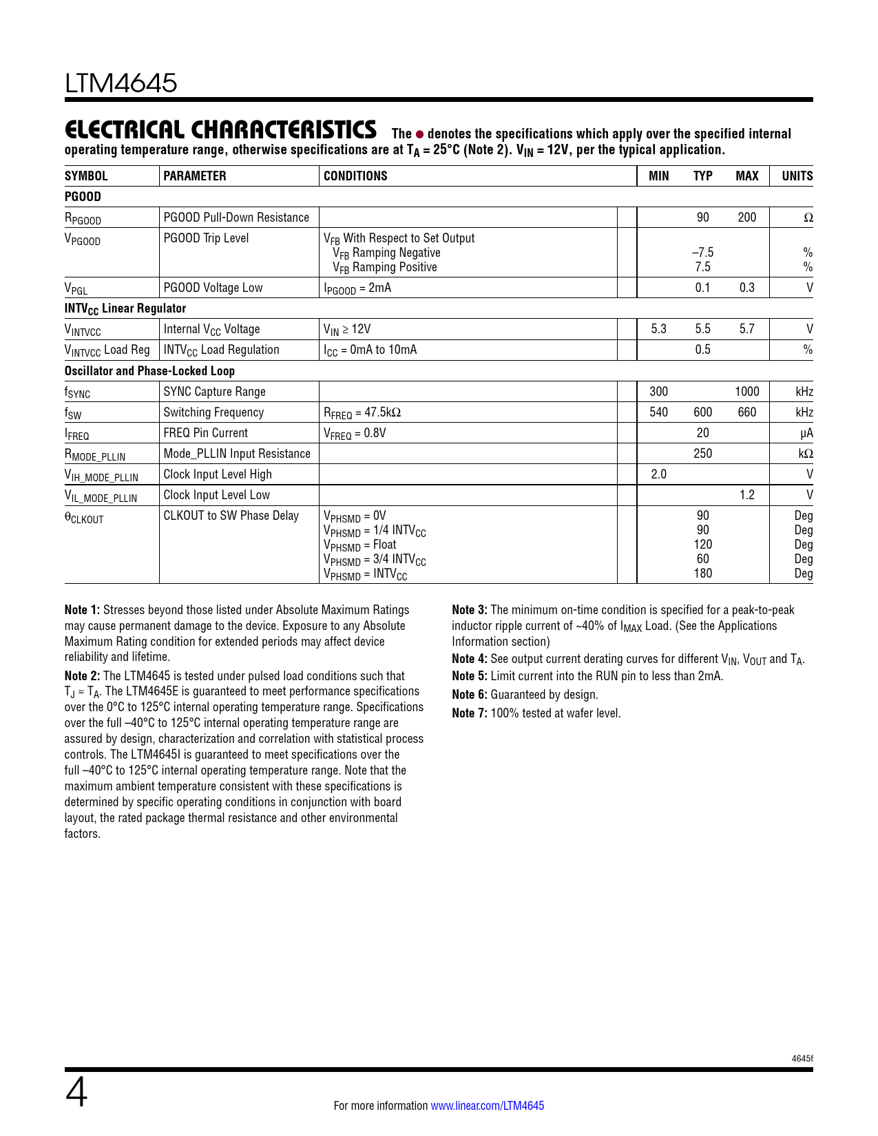 LTM4645 e lecTrical characTerisTics The l denotes the specifications which apply over the specified internaloperating temperature range, otherwise specifications are at TA = 25°C (Note 2). VIN = 12V, per the typical application. SYMBOLPARAMETERCONDITIONSMINTYPMAXUNITSPGOOD RPGOOD PGOOD Pull-Down Resistance 90 200 Ω VPGOOD PGOOD Trip Level VFB With Respect to Set Output VFB Ramping Negative –7.5 % VFB Ramping Positive 7.5 % VPGL PGOOD Voltage Low IPGOOD = 2mA 0.1 0.3 V INTVCC Linear Regulator VINTVCC Internal VCC Voltage VIN ≥ 12V 5.3 5.5 5.7 V VINTVCC Load Reg INTVCC Load Regulation ICC = 0mA to 10mA 0.5 % Oscillator and Phase-Locked Loop fSYNC SYNC Capture Range 300 1000 kHz fSW Switching Frequency RFREQ = 47.5kΩ 540 600 660 kHz IFREQ FREQ Pin Current VFREQ = 0.8V 20 µA RMODE_PLLIN Mode_PLLIN Input Resistance 250 kΩ VIH_MODE_PLLIN Clock Input Level High 2.0 V VIL_MODE_PLLIN Clock Input Level Low 1.2 V θCLKOUT CLKOUT to SW Phase Delay VPHSMD = 0V 90 Deg VPHSMD = 1/4 INTVCC 90 Deg VPHSMD = Float 120 Deg VPHSMD = 3/4 INTVCC 60 Deg VPHSMD = INTVCC 180 Deg Note 1: Stresses beyond those listed under Absolute Maximum Ratings Note 3: The minimum on-time condition is specified for a peak-to-peak may cause permanent damage to the device. Exposure to any Absolute inductor ripple current of ~40% of IMAX Load. (See the Applications Maximum Rating condition for extended periods may affect device Information section) reliability and lifetime. Note 4: See output current derating curves for different VIN, VOUT and TA. Note 2: The LTM4645 is tested under pulsed load conditions such that Note 5: Limit current into the RUN pin to less than 2mA. TJ ≈ TA. The LTM4645E is guaranteed to meet performance specifications Note 6: Guaranteed by design. over the 0°C to 125°C internal operating temperature range. Specifications Note 7: 100% tested at wafer level. over the full –40°C to 125°C internal operating temperature range are assured by design, characterization and correlation with statistical process controls. The LTM4645I is guaranteed to meet specifications over the full –40°C to 125°C internal operating temperature range. Note that the maximum ambient temperature consistent with these specifications is determined by specific operating conditions in conjunction with board layout, the rated package thermal resistance and other environmental factors. 4645f 4 For more information www.linear.com/LTM4645 Document Outline Features Applications Description Typical Application Absolute Maximum Ratings Pin Configuration Order Information Electrical Characteristics Typical Performance Characteristics Pin Functions Block Diagram Decoupling Requirements Operation Applications Information Typical Applications Package Description Package Photo Design Resources Related Parts