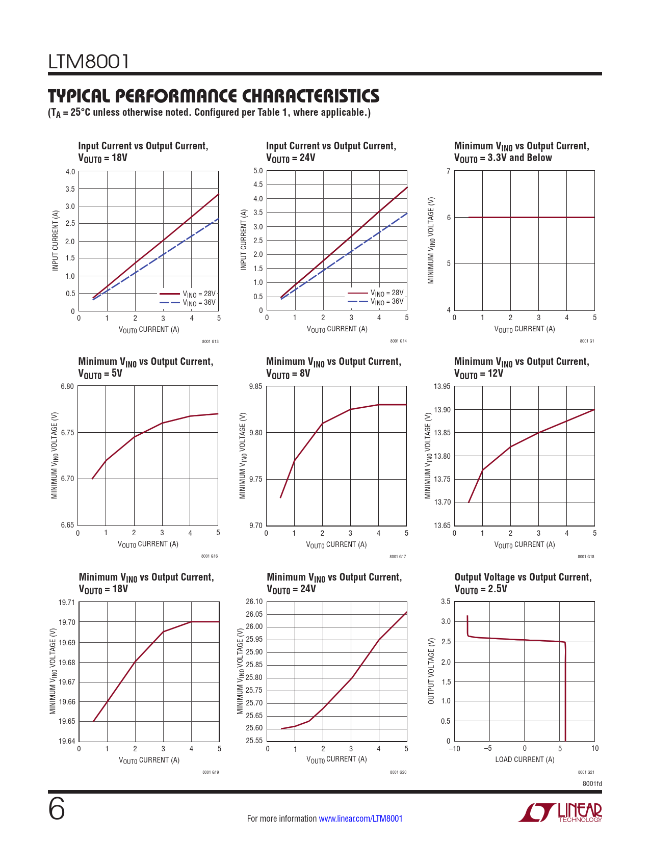 6.80 9.85 13.95 13.90 6.75 9.80 13.85 VOLTAGE (V) VOLTAGE (V) VOLTAGE (V) 13.80 IN0 IN0 IN0 6.70 9.75 13.75 MINIMUM V MINIMUM V MINIMUM V 13.70 6.65 9.70 13.65 0 1 2 3 4 5 0 1 2 3 4 5 0 1 2 3 4 5 VOUT0 CURRENT (A) VOUT0 CURRENT (A) VOUT0 CURRENT (A) 8001 G16 8001 G17 8001 G18