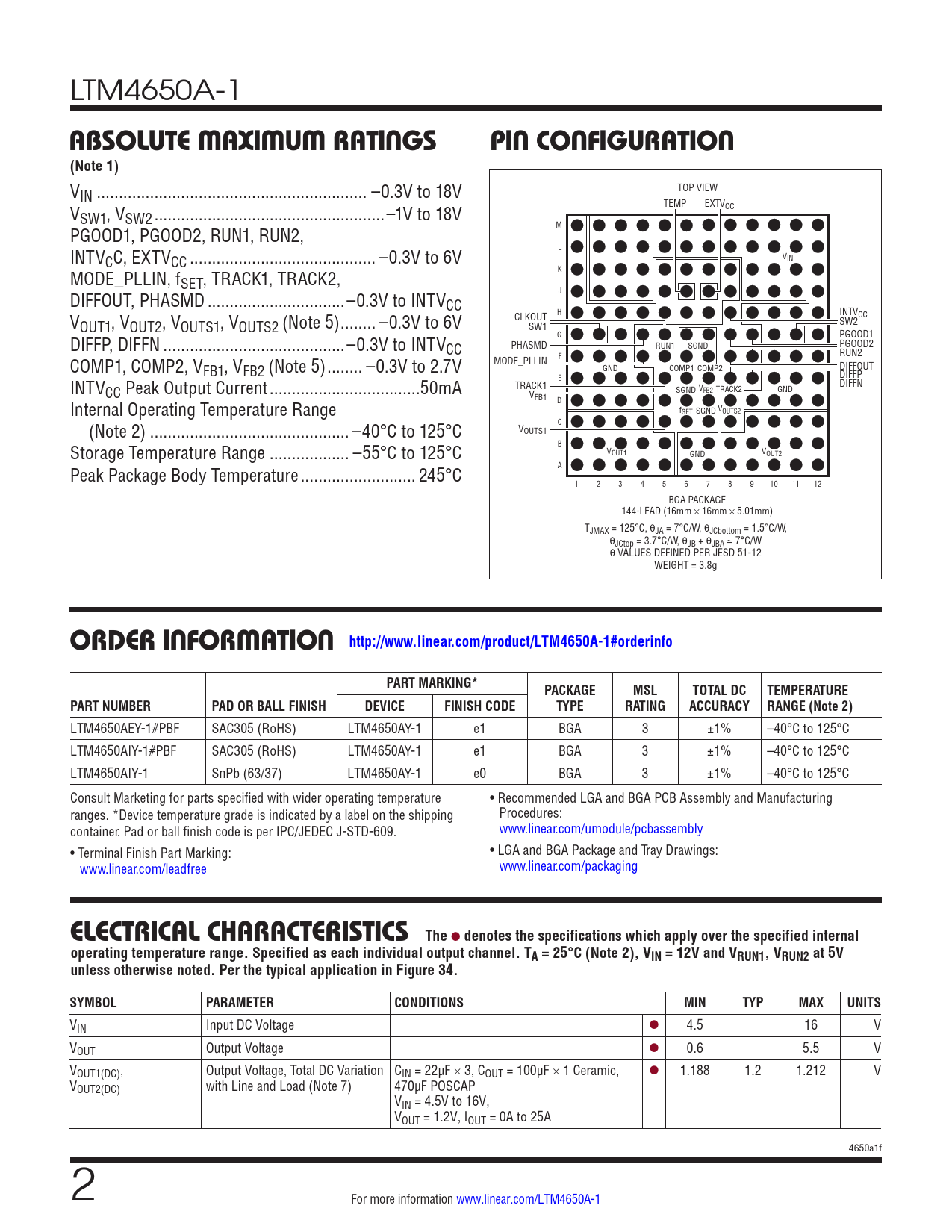 LTM4650A-1 ABSOLUTE MAXIMUM RATINGSPIN CONFIGURATION(Note 1) VIN ... –0.3V to 18V TOP VIEW V TEMP EXTVCC SW1, VSW2 ..–1V to 18V PGOOD1, PGOOD2, RUN1, RUN2, M INTV L CC, EXTVCC .. –0.3V to 6V VIN MODE_PLLIN, f K SET, TRACK1, TRACK2, DIFFOUT, PHASMD ...–0.3V to INTV J CC V CLKOUT H INTVCC OUT1, VOUT2, VOUTS1, VOUTS2 (Note 5) .. –0.3V to 6V SW1 SW2 DIFFP, DIFFN ...–0.3V to INTV G PGOOD1 CC PHASMD RUN1 SGND PGOOD2 RUN2 COMP1, COMP2, V F MODE_PLLIN FB1, VFB2 (Note 5) .. –0.3V to 2.7V GND COMP1 COMP2 DIFFOUT DIFFP INTV E DIFFN CC Peak Output Current ..50mA TRACK1 SGND VFB2 TRACK2 V GND FB1 Internal Operating Temperature Range D f V SET SGND OUTS2 (Note 2) ... –40°C to 125°C C VOUTS1 Storage Temperature Range .. –55°C to 125°C B VOUT1 V GND OUT2 Peak Package Body Temperature .. 245°C A 1 2 3 4 5 6 7 8 9 10 11 12 BGA PACKAGE 144-LEAD (16mm × 16mm × 5.01mm) TJMAX = 125°C, θJA = 7°C/W, θJCbottom = 1.5°C/W, θJCtop = 3.7°C/W, θJB + θJBA ≅ 7°C/W θ VALUES DEFINED PER JESD 51-12 WEIGHT = 3.8g ORDER INFORMATION http://www.linear.com/product/LTM4650A-1#orderinfoPART MARKING*PACKAGEMSLTOTAL DCTEMPERATURE PART NUMBERPAD OR BALL FINISHDEVICEFINISH CODETYPERATINGACCURACY RANGE (Note 2) LTM4650AEY-1#PBF SAC305 (RoHS) LTM4650AY-1 e1 BGA 3 ±1% –40°C to 125°C LTM4650AIY-1#PBF SAC305 (RoHS) LTM4650AY-1 e1 BGA 3 ±1% –40°C to 125°C LTM4650AIY-1 SnPb (63/37) LTM4650AY-1 e0 BGA 3 ±1% –40°C to 125°C Consult Marketing for parts specified with wider operating temperature • Recommended LGA and BGA PCB Assembly and Manufacturing ranges. *Device temperature grade is indicated by a label on the shipping Procedures: container. Pad or ball finish code is per IPC/JEDEC J-STD-609. www.linear.com/umodule/pcbassembly • Terminal Finish Part Marking: • LGA and BGA Package and Tray Drawings: www.linear.com/leadfree www.linear.com/packaging ELECTRICAL CHARACTERISTICSThe l denotes the specifications which apply over the specified internaloperating temperature range. Specified as each individual output channel. TA = 25°C (Note 2), VIN = 12V and VRUN1, VRUN2 at 5Vunless otherwise noted. Per the typical application in Figure 34.SYMBOLPARAMETERCONDITIONSMINTYPMAXUNITS VIN Input DC Voltage l 4.5 16 V VOUT Output Voltage l 0.6 5.5 V VOUT1(DC), Output Voltage, Total DC Variation CIN = 22µF × 3, COUT = 100µF × 1 Ceramic, l 1.188 1.2 1.212 V VOUT2(DC) with Line and Load (Note 7) 470µF POSCAP VIN = 4.5V to 16V, VOUT = 1.2V, IOUT = 0A to 25A 4650a1f 2 For more information www.linear.com/LTM4650A-1 Document Outline Features Applications Typical Application Description Absolute Maximum Ratings Order Information Electrical Characteristics Pin Configuration Typical Performance Characteristics Pin Functions Simplified Block Diagram Decoupling Requirements Operation Applications Information Typical Applications Package Description Typical Application Package Photo Design Resources Related Parts