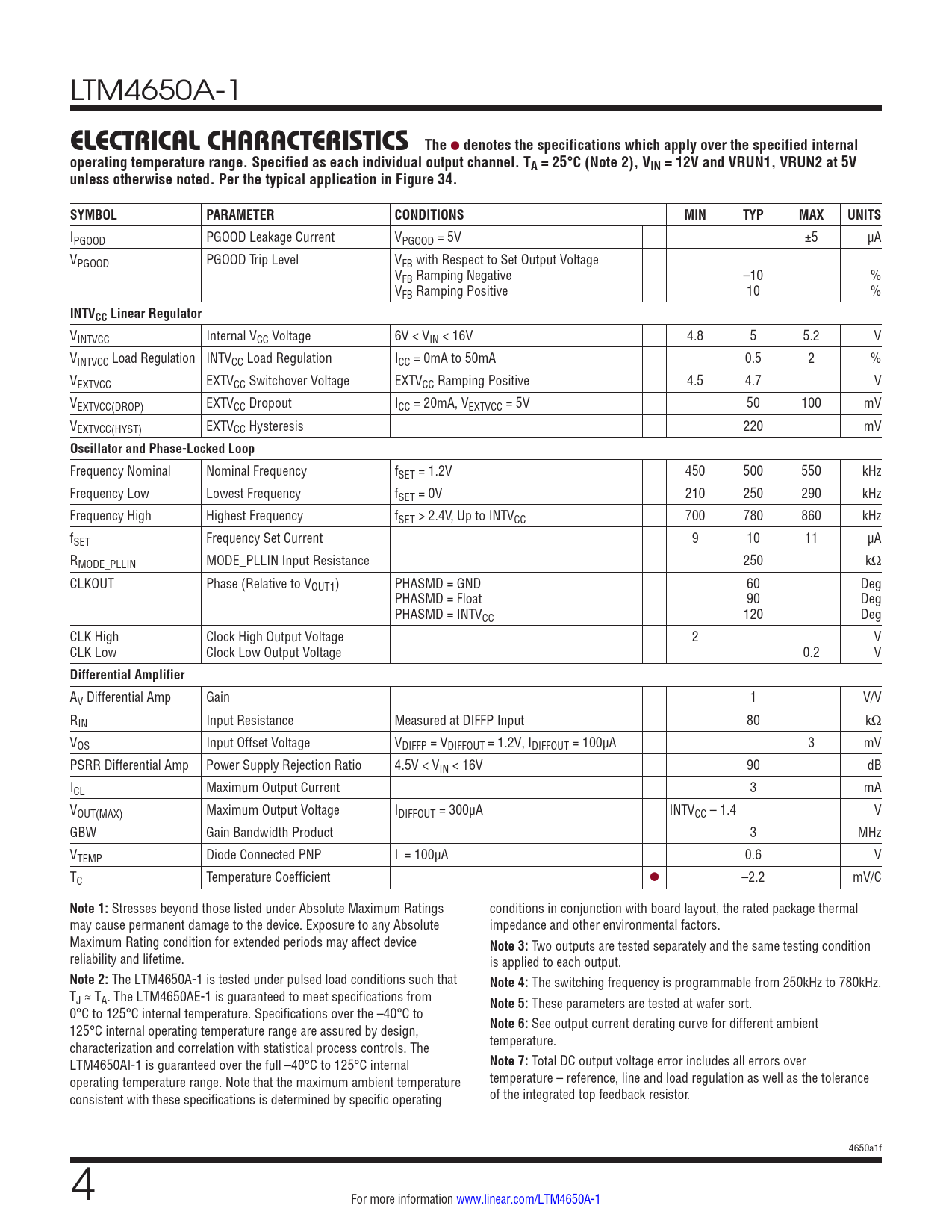 LTM4650A-1 ELECTRICAL CHARACTERISTICSThe l denotes the specifications which apply over the specified internaloperating temperature range. Specified as each individual output channel. TA = 25°C (Note 2), VIN = 12V and VRUN1, VRUN2 at 5Vunless otherwise noted. Per the typical application in Figure 34.SYMBOLPARAMETERCONDITIONSMINTYPMAXUNITS IPGOOD PGOOD Leakage Current VPGOOD = 5V ±5 µA VPGOOD PGOOD Trip Level VFB with Respect to Set Output Voltage VFB Ramping Negative –10 % VFB Ramping Positive 10 % INTVCC Linear Regulator VINTVCC Internal VCC Voltage 6V < VIN < 16V 4.8 5 5.2 V VINTVCC Load Regulation INTVCC Load Regulation ICC = 0mA to 50mA 0.5 2 % VEXTVCC EXTVCC Switchover Voltage EXTVCC Ramping Positive 4.5 4.7 V VEXTVCC(DROP) EXTVCC Dropout ICC = 20mA, VEXTVCC = 5V 50 100 mV VEXTVCC(HYST) EXTVCC Hysteresis 220 mV Oscillator and Phase-Locked Loop Frequency Nominal Nominal Frequency fSET = 1.2V 450 500 550 kHz Frequency Low Lowest Frequency fSET = 0V 210 250 290 kHz Frequency High Highest Frequency fSET > 2.4V, Up to INTVCC 700 780 860 kHz fSET Frequency Set Current 9 10 11 µA RMODE_PLLIN MODE_PLLIN Input Resistance 250 kΩ CLKOUT Phase (Relative to VOUT1) PHASMD = GND 60 Deg PHASMD = Float 90 Deg PHASMD = INTVCC 120 Deg CLK High Clock High Output Voltage 2 V CLK Low Clock Low Output Voltage 0.2 V Differential Amplifier AV Differential Amp Gain 1 V/V RIN Input Resistance Measured at DIFFP Input 80 kΩ VOS Input Offset Voltage VDIFFP = VDIFFOUT = 1.2V, IDIFFOUT = 100µA 3 mV PSRR Differential Amp Power Supply Rejection Ratio 4.5V < VIN < 16V 90 dB ICL Maximum Output Current 3 mA VOUT(MAX) Maximum Output Voltage IDIFFOUT = 300µA INTVCC – 1.4 V GBW Gain Bandwidth Product 3 MHz VTEMP Diode Connected PNP I = 100µA 0.6 V TC Temperature Coefficient l –2.2 mV/C Note 1: Stresses beyond those listed under Absolute Maximum Ratings conditions in conjunction with board layout, the rated package thermal may cause permanent damage to the device. Exposure to any Absolute impedance and other environmental factors. Maximum Rating condition for extended periods may affect device Note 3: Two outputs are tested separately and the same testing condition reliability and lifetime. is applied to each output. Note 2: The LTM4650A-1 is tested under pulsed load conditions such that Note 4: The switching frequency is programmable from 250kHz to 780kHz. TJ ≈ TA. The LTM4650AE-1 is guaranteed to meet specifications from Note 5: These parameters are tested at wafer sort. 0°C to 125°C internal temperature. Specifications over the –40°C to 125°C internal operating temperature range are assured by design, Note 6: See output current derating curve for different ambient characterization and correlation with statistical process controls. The temperature. LTM4650AI-1 is guaranteed over the full –40°C to 125°C internal Note 7: Total DC output voltage error includes all errors over operating temperature range. Note that the maximum ambient temperature temperature – reference, line and load regulation as well as the tolerance consistent with these specifications is determined by specific operating of the integrated top feedback resistor. 4650a1f 4 For more information www.linear.com/LTM4650A-1 Document Outline Features Applications Typical Application Description Absolute Maximum Ratings Order Information Electrical Characteristics Pin Configuration Typical Performance Characteristics Pin Functions Simplified Block Diagram Decoupling Requirements Operation Applications Information Typical Applications Package Description Typical Application Package Photo Design Resources Related Parts