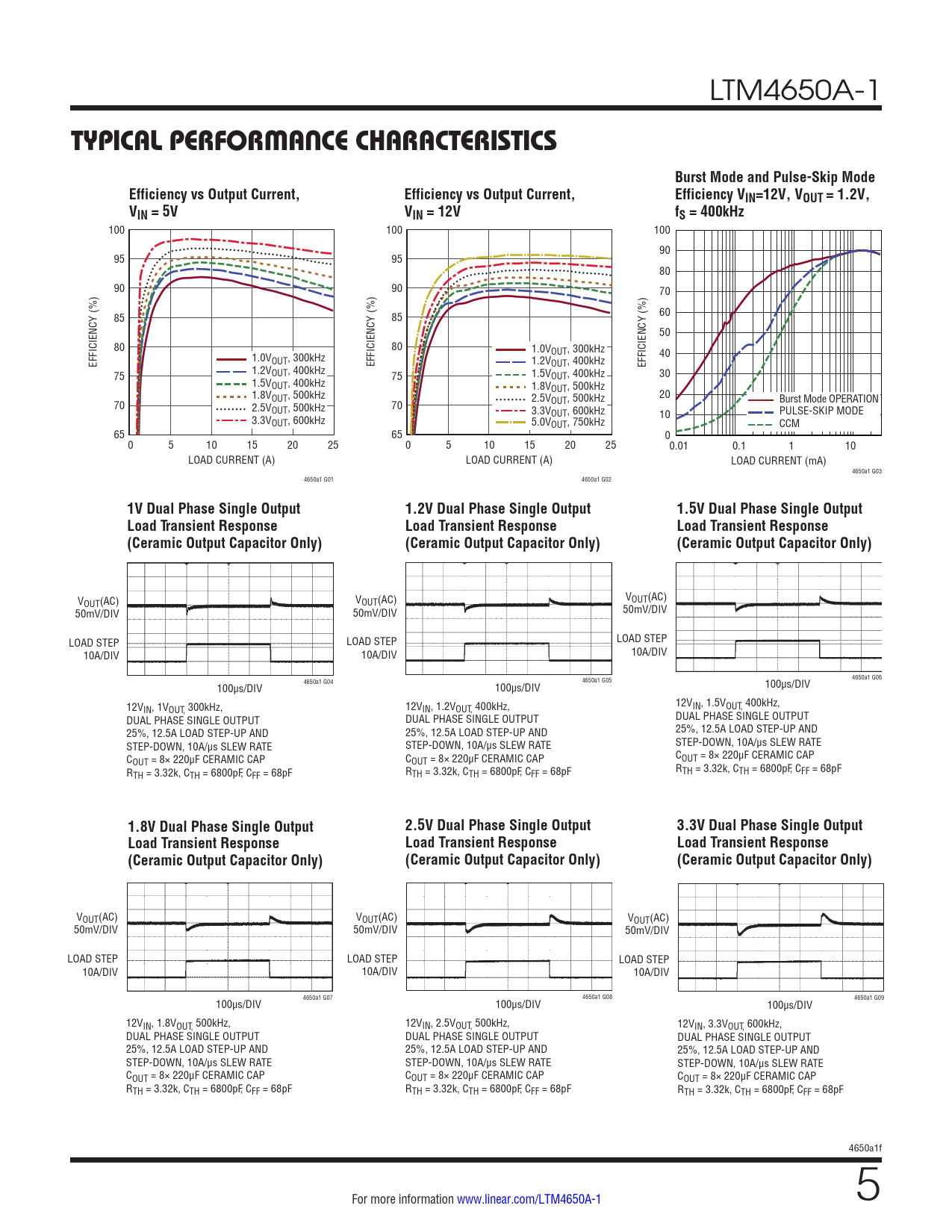 V V OUT(AC) VOUT(AC) OUT(AC) 50mV/DIV 50mV/DIV 50mV/DIV LOAD STEP LOAD STEP LOAD STEP 10A/DIV 10A/DIV 10A/DIV 4650a1 G06 4650a1 G04 4650a1 G05 100µs/DIV 100µs/DIV 100µs/DIV 12V 12V IN, 1VOUT, 300kHz, 12VIN, 1.2VOUT, 400kHz, IN, 1.5VOUT, 400kHz, DUAL PHASE SINGLE OUTPUT DUAL PHASE SINGLE OUTPUT DUAL PHASE SINGLE OUTPUT 25%, 12.5A LOAD STEP-UP AND 25%, 12.5A LOAD STEP-UP AND 25%, 12.5A LOAD STEP-UP AND STEP-DOWN, 10A/μs SLEW RATE STEP-DOWN, 10A/μs SLEW RATE STEP-DOWN, 10A/μs SLEW RATE C C OUT = 8× 220μF CERAMIC CAP COUT = 8× 220μF CERAMIC CAP OUT = 8× 220μF CERAMIC CAP R R TH = 3.32k, CTH = 6800pF, CFF = 68pF RTH = 3.32k, CTH = 6800pF, CFF = 68pF TH = 3.32k, CTH = 6800pF, CFF = 68pF