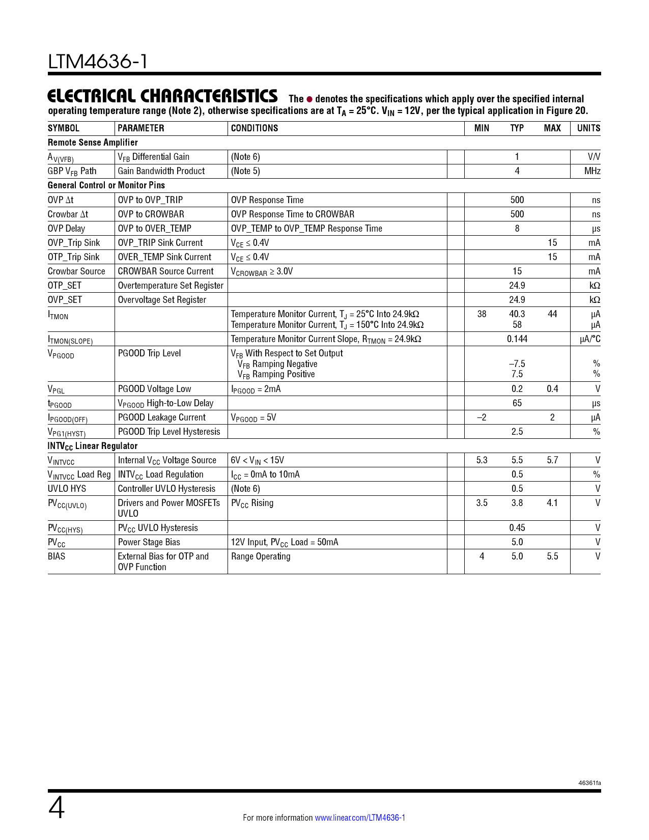 VINTVCC Internal VCC Voltage Source 6V < VIN < 15V 5.3 5.5 5.7 V VINTVCC Load Reg INTVCC Load Regulation ICC = 0mA to 10mA 0.5 % UVLO HYS Controller UVLO Hysteresis (Note 6) 0.5 V PVCC(UVLO) Drivers and Power MOSFETs PVCC Rising 3.5 3.8 4.1 V UVLO PVCC(HYS) PVCC UVLO Hysteresis 0.45 V PVCC Power Stage Bias 12V Input, PVCC Load = 50mA 5.0 V BIAS External Bias for OTP and Range Operating 4 5.0 5.5 V OVP Function 46361fa 4 For more information www.linear.com/LTM4636-1