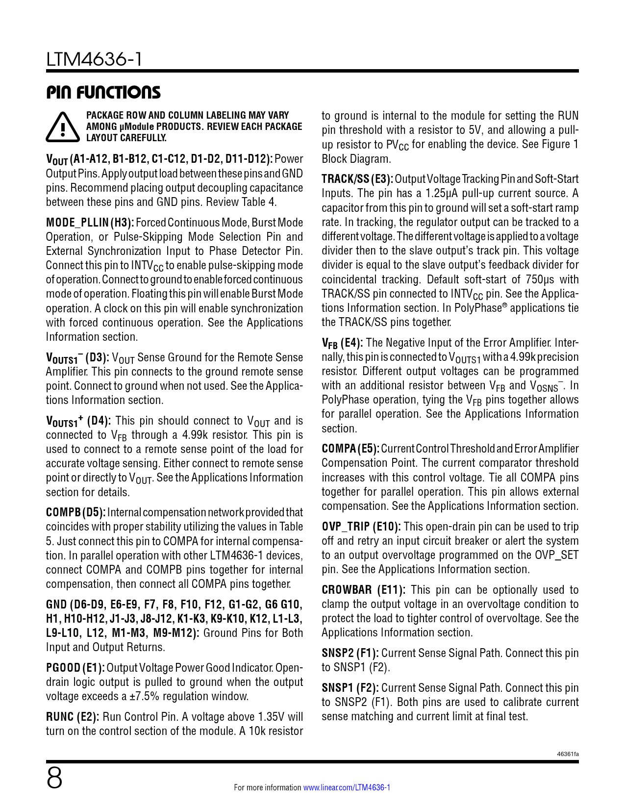 LTM4636-1 PIN FUNCTIONS PACKAGE ROW AND COLUMN LABELING MAY VARY to ground is internal to the module for setting the RUN AMONG µModule PRODUCTS. REVIEW EACH PACKAGE pin threshold with a resistor to 5V, and allowing a pull- LAYOUT CAREFULLY. up resistor to PVCC for enabling the device. See Figure 1 VOUT (A1-A12, B1-B12, C1-C12, D1-D2, D11-D12): Power Block Diagram. Output Pins. Apply output load between these pins and GND TRACK/SS (E3): Output Voltage Tracking Pin and Soft-Start pins. Recommend placing output decoupling capacitance Inputs. The pin has a 1.25µA pull-up current source. A between these pins and GND pins. Review Table 4. capacitor from this pin to ground will set a soft-start ramp MODE_PLLIN (H3): Forced Continuous Mode, Burst Mode rate. In tracking, the regulator output can be tracked to a Operation, or Pulse-Skipping Mode Selection Pin and different voltage. The different voltage is applied to a voltage External Synchronization Input to Phase Detector Pin. divider then to the slave output’s track pin. This voltage Connect this pin to INTVCC to enable pulse-skipping mode divider is equal to the slave output’s feedback divider for of operation. Connect to ground to enable forced continuous coincidental tracking. Default soft-start of 750µs with mode of operation. Floating this pin will enable Burst Mode TRACK/SS pin connected to INTVCC pin. See the Applica- operation. A clock on this pin will enable synchronization tions Information section. In PolyPhase® applications tie with forced continuous operation. See the Applications the TRACK/SS pins together. Information section. VFB (E4): The Negative Input of the Error Amplifier. Inter- V–OUTS1 (D3): VOUT Sense Ground for the Remote Sense nally, this pin is connected to VOUTS1 with a 4.99k precision Amplifier. This pin connects to the ground remote sense resistor. Different output voltages can be programmed point. Connect to ground when not used. See the Applica- with an additional resistor between V – FB and VOSNS . In tions Information section. PolyPhase operation, tying the VFB pins together allows V+ for parallel operation. See the Applications Information OUTS1 (D4): This pin should connect to VOUT and is connected to V section. FB through a 4.99k resistor. This pin is used to connect to a remote sense point of the load for COMPA (E5): Current Control Threshold and Error Amplifier accurate voltage sensing. Either connect to remote sense Compensation Point. The current comparator threshold point or directly to VOUT. See the Applications Information increases with this control voltage. Tie all COMPA pins section for details. together for parallel operation. This pin allows external COMPB (D5): Internal compensation network provided that compensation. See the Applications Information section. coincides with proper stability utilizing the values in Table OVP_TRIP (E10): This open-drain pin can be used to trip 5. Just connect this pin to COMPA for internal compensa- off and retry an input circuit breaker or alert the system tion. In parallel operation with other LTM4636-1 devices, to an output overvoltage programmed on the OVP_SET connect COMPA and COMPB pins together for internal pin. See the Applications Information section. compensation, then connect all COMPA pins together. CROWBAR (E11): This pin can be optionally used to GND (D6-D9, E6-E9, F7, F8, F10, F12, G1-G2, G6 G10, clamp the output voltage in an overvoltage condition to H1, H10-H12, J1-J3, J8-J12, K1-K3, K9-K10, K12, L1-L3, protect the load to tighter control of overvoltage. See the L9-L10, L12, M1-M3, M9-M12): Ground Pins for Both Applications Information section. Input and Output Returns. SNSP2 (F1): Current Sense Signal Path. Connect this pin PGOOD (E1): Output Voltage Power Good Indicator. Open- to SNSP1 (F2). drain logic output is pulled to ground when the output SNSP1 (F2): Current Sense Signal Path. Connect this pin voltage exceeds a ±7.5% regulation window. to SNSP2 (F1). Both pins are used to calibrate current RUNC (E2): Run Control Pin. A voltage above 1.35V will sense matching and current limit at final test. turn on the control section of the module. A 10k resistor 46361fa 8 For more information www.linear.com/LTM4636-1