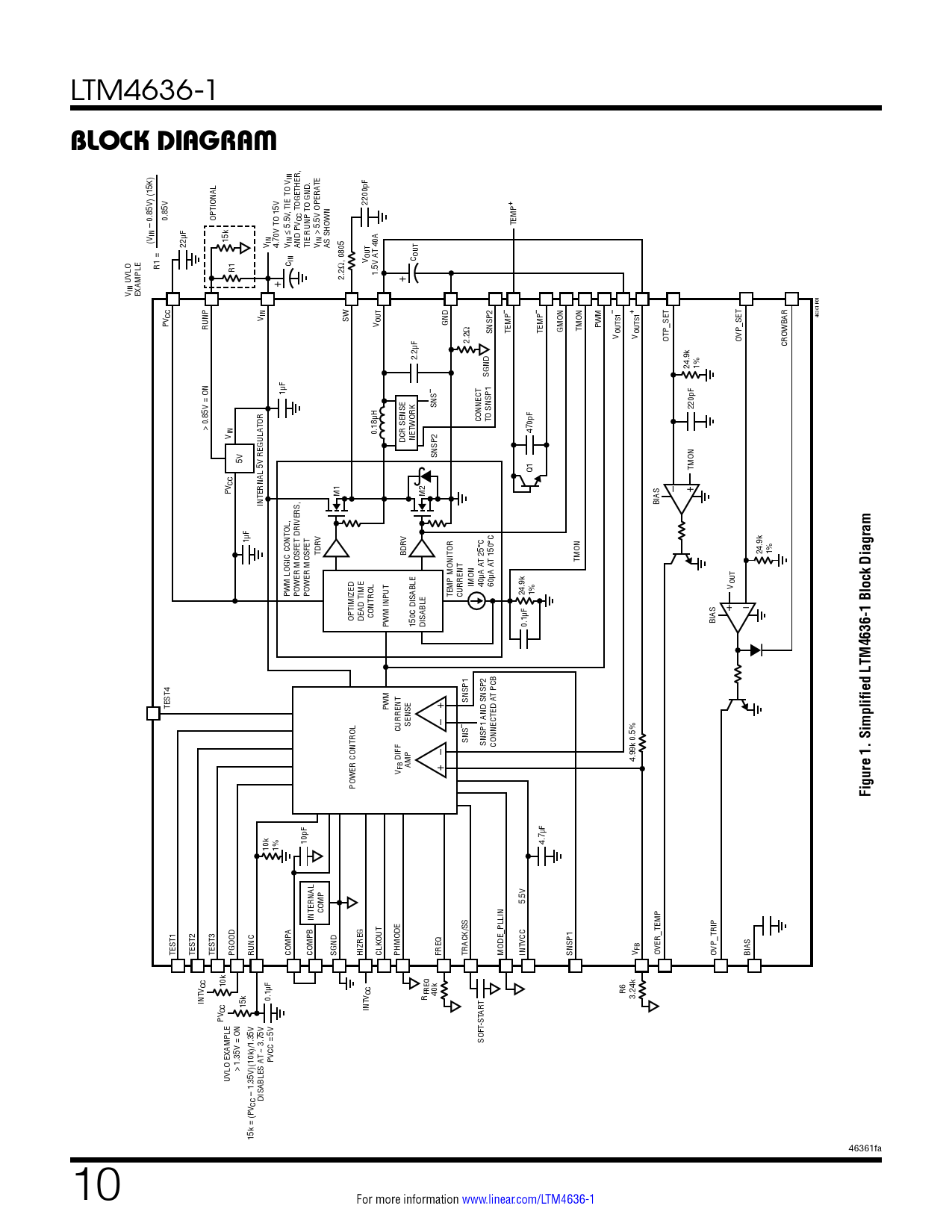 LTM4636-1 BLOCK DIAGRAM IN TE 2200pF + TIONAL , TIE TO V TOGETHER, 0.85V OP V CC TEMP – 0.85V) (15K) IN ≤ 5.5V > 5.5V OPERA (V 22µF 15k V IN 4.70V TO 15V V IN AND P TIE RUNP TO GND. V IN AS SHOWN T 40A V OUT C IN C OUT R1 = R1 1.5V A UVLO + 2.2Ω, 0805 + V IN EXAMPLE – – CC M – + V IN SW 46361 F01 PV V OUT GND RUNP SNSP2 TEMP TEMP GMON TMON PW 2.2Ω V OUTS1 V OUTS1 OTP_SET OVP_SET CROWBAR 2.2µF 24.9k 1% SGND F 1µ – SNS 220pF CONNECT TO SNSP1 > 0.85V = ON TOR WORK 0.18µH 470pF V IN DCR SENSE NET SNSP2 5V Q1 TMON CC – + PV M1 M2 INTERNAL 5V REGULA BIAS F 1µ V V TDR BDR 24.9k 1% T 25°C T 150°C TMON IMON 40µA A 60µA A V OUT PWM LOGIC CONTOL, POWER MOSFET DRIVERS, POWER MOSFET TEMP MONITOR CURRENT 24.9k 1% TIMIZED + – µF OP DEAD TIME CONTROL PWM INPUT 150C DISABLE DISABLE 0.1 BIAS M T PCB SNSP1 TEST4 PW + SENSE – – CURRENT SNS SNSP1 AND SNSP2 – CONNECTED A DIFF 4.99k 0.5% AMP + V FB POWER CONTROL Figure 1. Simplified LTM4636-1 Block Diagram 10pF 4.7µF 10k 1% 5.5V COMP INTERNAL A VCC TEST1 TEST2 TEST3 PGOOD RUNC COMP COMPB SGND HIZREG CLKOUT PHMODE FREQ TRACK/SS MODE_PLLIN INT SNSP1 V FB OVER_TEMP OVP_TRIP BIAS 10k V CC µF R6 0.1 V CC R FREQ 40k 3.24k INT T 15k CC INT AR PV T-ST SOF T ~ 3.75V PVCC = 5V > 1.35V = ON UVLO EXAMPLE – 1.35V)(10k)/1.35V DISABLES A V CC 15k = (P 46361fa 10 For more information www.linear.com/LTM4636-1