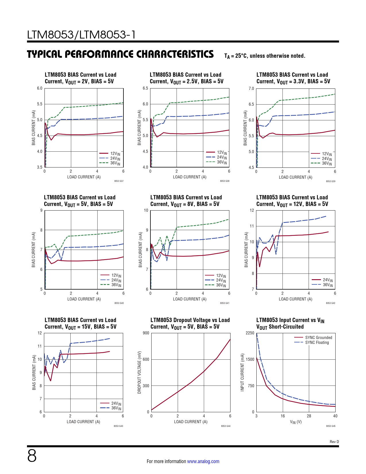 9 10 12 11 8 9 10 7 8 9 BIAS CURRENT (mA) BIAS CURRENT (mA) BIAS CURRENT (mA) 6 7 12V 8 IN 12VIN 24VIN 24VIN 24VIN 36VIN 36VIN 36VIN 5 6 7 0 2 4 6 0 2 4 6 0 2 4 6 LOAD CURRENT (A) LOAD CURRENT (A) LOAD CURRENT (A) 8053 G40 8053 G41 8053 G42