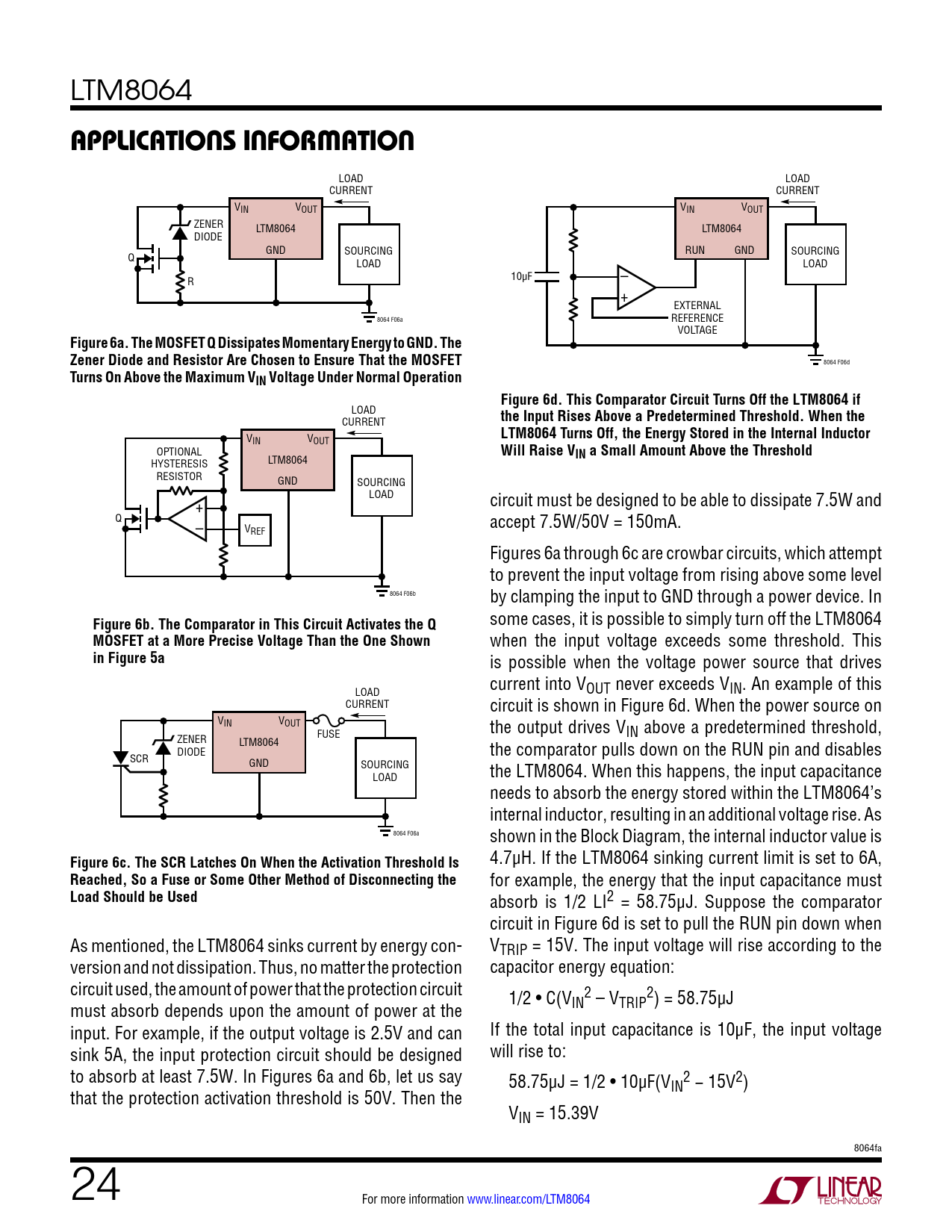 LTM8064 HYSTERESIS RESISTOR GND SOURCING LOAD + circuit must be designed to be able to dissipate 7.5W and Q – accept 7.5W/50V = 150mA. VREF Figures 6a through 6c are crowbar circuits, which attempt to prevent the input voltage from rising above some level 8064 F06b by clamping the input to GND through a power device. In