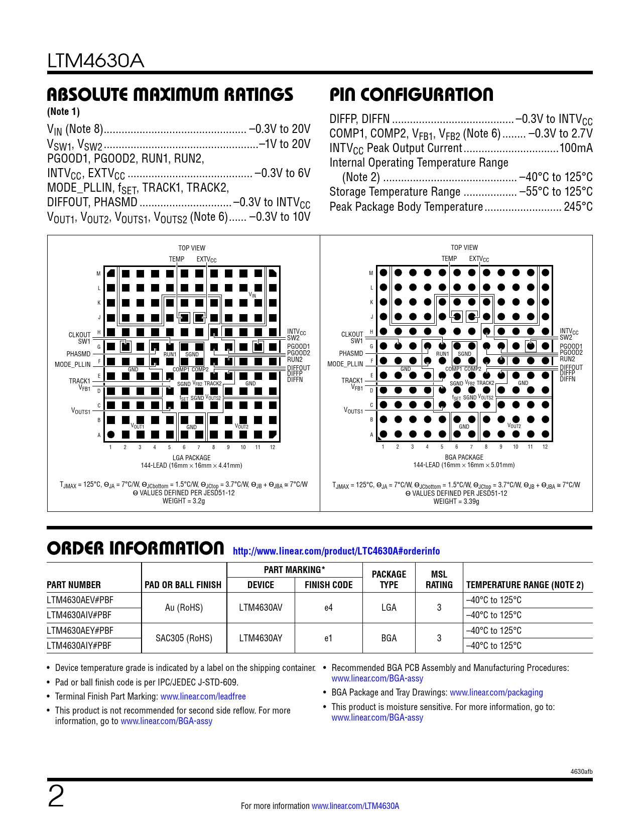DIFFP, DIFFN ... –0.3V to INTV V CC IN (Note 8) .. –0.3V to 20V COMP1, COMP2, V V FB1, VFB2 (Note 6) .. –0.3V to 2.7V SW1, VSW2 ..–1V to 20V INTV PGOOD1, PGOOD2, RUN1, RUN2, CC Peak Output Current ..100mA Internal Operating Temperature Range INTVCC, EXTVCC .. –0.3V to 6V (Note 2) ... –40°C to 125°C MODE_PLLIN, fSET, TRACK1, TRACK2, Storage Temperature Range .. –55°C to 125°C DIFFOUT, PHASMD ... –0.3V to INTVCC Peak Package Body Temperature .. 245°C VOUT1, VOUT2, VOUTS1, VOUTS2 (Note 6) .. –0.3V to 10V TOP VIEW TOP VIEW TEMP EXTVCC TEMP EXTVCC M M L L VIN K K J J CLKOUT H INTVCC CLKOUT H INTVCC SW1 SW2 SW1 SW2 G PGOOD1 G PGOOD1 PHASMD RUN1 SGND PGOOD2 PHASMD RUN1 SGND PGOOD2 F RUN2 RUN2 MODE_PLLIN F MODE_PLLIN GND COMP1 COMP2 DIFFOUT GND COMP1 COMP2 DIFFOUT E DIFFP DIFFP DIFFN E TRACK1 DIFFN SGND V TRACK1 FB2 TRACK2 SGND VFB2 TRACK2 GND V GND FB1 V D FB1 D f V f V SET SGND OUTS2 SET SGND OUTS2 C C VOUTS1 VOUTS1 B B VOUT1 V GND OUT2 V GND OUT2 A A 1 2 3 4 5 6 7 8 9 10 11 12 1 2 3 4 5 6 7 8 9 10 11 12 LGA PACKAGE BGA PACKAGE 144-LEAD (16mm × 16mm × 4.41mm) 144-LEAD (16mm × 16mm × 5.01mm) TJMAX = 125°C, ΘJA = 7°C/W, ΘJCbottom = 1.5°C/W, ΘJCtop = 3.7°C/W, ΘJB + ΘJBA ≅ 7°C/W TJMAX = 125°C, ΘJA = 7°C/W, ΘJCbottom = 1.5°C/W, ΘJCtop = 3.7°C/W, ΘJB + ΘJBA ≅ 7°C/W Θ VALUES DEFINED PER JESD51-12 Θ VALUES DEFINED PER JESD51-12 WEIGHT = 3.2g WEIGHT = 3.39g