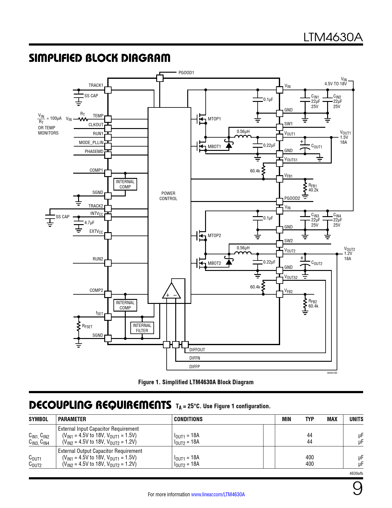 Figure 1. Simplified LTM4630A Block Diagram DECOUPLING REQUIREMENTS TA = 25°C. Use Figure 1 configuration. SYMBOL PARAMETER CONDITIONS MIN TYP MAX UNITS
