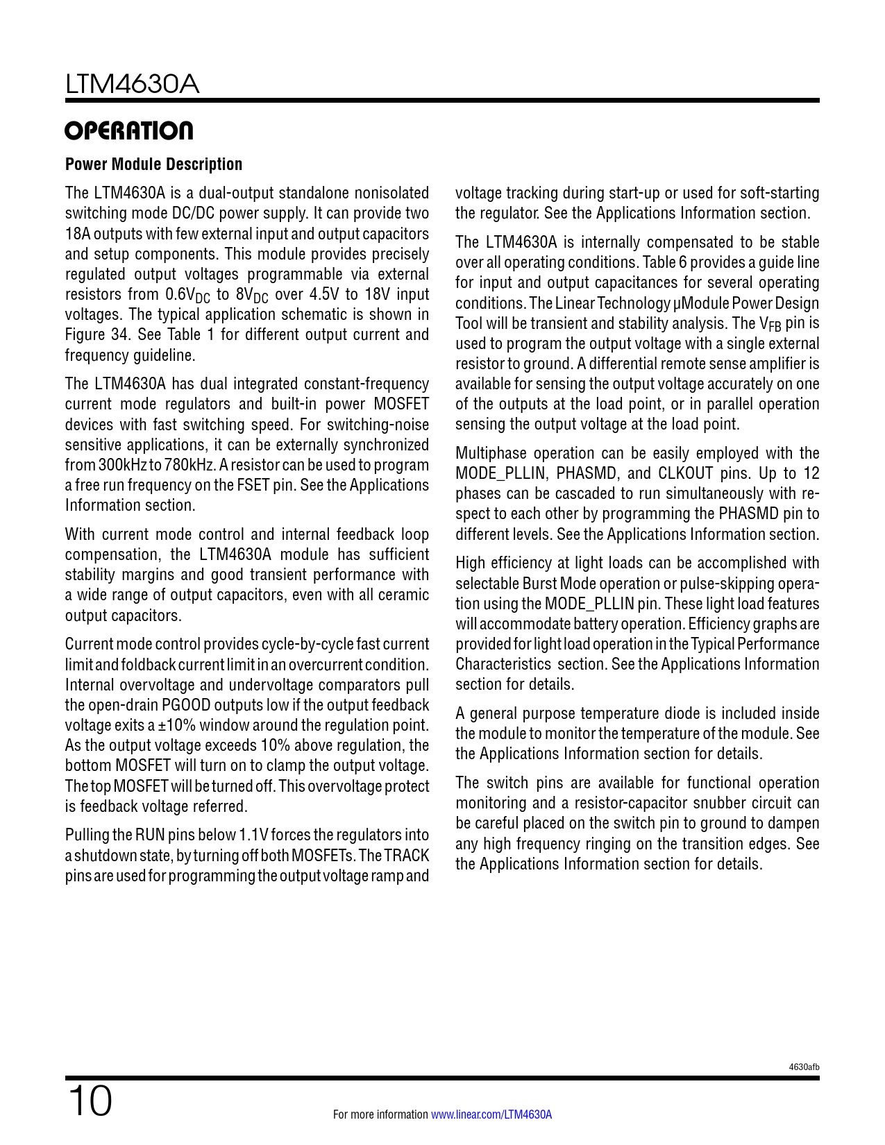 LTM4630A OPERATIONPower Module Description The LTM4630A is a dual-output standalone nonisolated voltage tracking during start-up or used for soft-starting switching mode DC/DC power supply. It can provide two the regulator. See the Applications Information section. 18A outputs with few external input and output capacitors The LTM4630A is internally compensated to be stable and setup components. This module provides precisely over all operating conditions. Table 6 provides a guide line regulated output voltages programmable via external for input and output capacitances for several operating resistors from 0.6VDC to 8VDC over 4.5V to 18V input conditions. The Linear Technology µModule Power Design voltages. The typical application schematic is shown in Tool will be transient and stability analysis. The V Figure 34. See Table 1 for different output current and FB pin is used to program the output voltage with a single external frequency guideline. resistor to ground. A differential remote sense amplifier is The LTM4630A has dual integrated constant-frequency available for sensing the output voltage accurately on one current mode regulators and built-in power MOSFET of the outputs at the load point, or in parallel operation devices with fast switching speed. For switching-noise sensing the output voltage at the load point. sensitive applications, it can be externally synchronized Multiphase operation can be easily employed with the from 300kHz to 780kHz. A resistor can be used to program MODE_PLLIN, PHASMD, and CLKOUT pins. Up to 12 a free run frequency on the FSET pin. See the Applications phases can be cascaded to run simultaneously with re- Information section. spect to each other by programming the PHASMD pin to With current mode control and internal feedback loop different levels. See the Applications Information section. compensation, the LTM4630A module has sufficient High efficiency at light loads can be accomplished with stability margins and good transient performance with selectable Burst Mode operation or pulse-skipping opera- a wide range of output capacitors, even with all ceramic tion using the MODE_PLLIN pin. These light load features output capacitors. will accommodate battery operation. Efficiency graphs are Current mode control provides cycle-by-cycle fast current provided for light load operation in the Typical Performance limit and foldback current limit in an overcurrent condition. Characteristics section. See the Applications Information Internal overvoltage and undervoltage comparators pull section for details. the open-drain PGOOD outputs low if the output feedback A general purpose temperature diode is included inside voltage exits a ±10% window around the regulation point. the module to monitor the temperature of the module. See As the output voltage exceeds 10% above regulation, the the Applications Information section for details. bottom MOSFET will turn on to clamp the output voltage. The top MOSFET will be turned off. This overvoltage protect The switch pins are available for functional operation is feedback voltage referred. monitoring and a resistor-capacitor snubber circuit can be careful placed on the switch pin to ground to dampen Pulling the RUN pins below 1.1V forces the regulators into any high frequency ringing on the transition edges. See a shutdown state, by turning off both MOSFETs. The TRACK the Applications Information section for details. pins are used for programming the output voltage ramp and 4630afb 10 For more information www.linear.com/LTM4630A Document Outline Description Typical Application Absolute Maximum Ratings Pin Configuration Electrical Characteristics Typical Performance Characteristics Pin Functions Operation Applications Information Related Parts