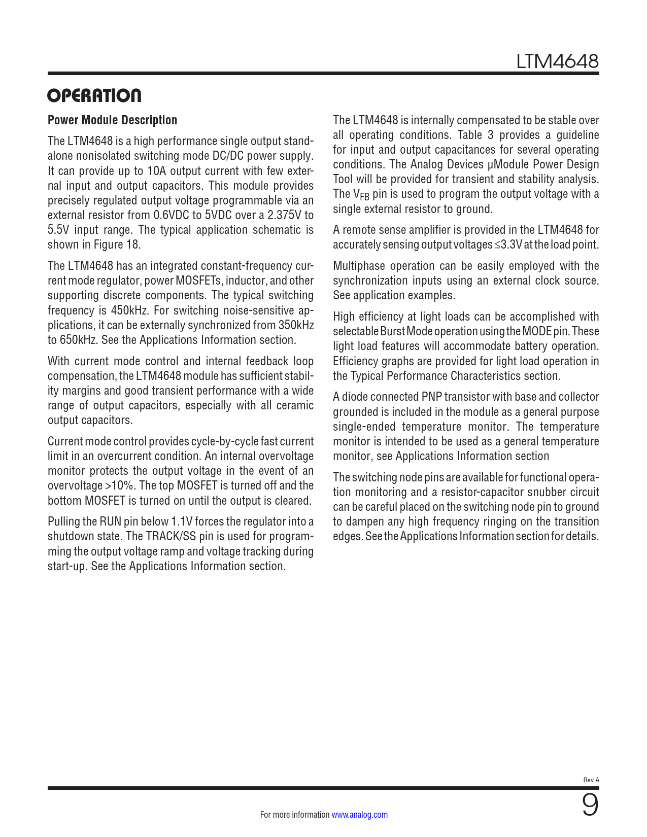 link to page 23 link to page 19 link to page 19 link to page 22 link to page 5 link to page 19 link to page 19 LTM4648 OPERATIONPower Module Description The LTM4648 is internally compensated to be stable over The LTM4648 is a high performance single output stand- all operating conditions. Table 3 provides a guideline alone nonisolated switching mode DC/DC power supply. for input and output capacitances for several operating It can provide up to 10A output current with few exter- conditions. The Analog Devices µModule Power Design nal input and output capacitors. This module provides Tool will be provided for transient and stability analysis. precisely regulated output voltage programmable via an The VFB pin is used to program the output voltage with a external resistor from 0.6VDC to 5VDC over a 2.375V to single external resistor to ground. 5.5V input range. The typical application schematic is A remote sense amplifier is provided in the LTM4648 for shown in Figure 18. accurately sensing output voltages ≤3.3V at the load point. The LTM4648 has an integrated constant-frequency cur- Multiphase operation can be easily employed with the rent mode regulator, power MOSFETs, inductor, and other synchronization inputs using an external clock source. supporting discrete components. The typical switching See application examples. frequency is 450kHz. For switching noise-sensitive ap- High efficiency at light loads can be accomplished with plications, it can be externally synchronized from 350kHz selectable Burst Mode operation using the MODE pin. These to 650kHz. See the Applications Information section. light load features will accommodate battery operation. With current mode control and internal feedback loop Efficiency graphs are provided for light load operation in compensation, the LTM4648 module has sufficient stabil- the Typical Performance Characteristics section. ity margins and good transient performance with a wide A diode connected PNP transistor with base and collector range of output capacitors, especially with all ceramic grounded is included in the module as a general purpose output capacitors. single-ended temperature monitor. The temperature Current mode control provides cycle-by-cycle fast current monitor is intended to be used as a general temperature limit in an overcurrent condition. An internal overvoltage monitor, see Applications Information section monitor protects the output voltage in the event of an The switching node pins are available for functional opera- overvoltage >10%. The top MOSFET is turned off and the tion monitoring and a resistor-capacitor snubber circuit bottom MOSFET is turned on until the output is cleared. can be careful placed on the switching node pin to ground Pulling the RUN pin below 1.1V forces the regulator into a to dampen any high frequency ringing on the transition shutdown state. The TRACK/SS pin is used for program- edges. See the Applications Information section for details. ming the output voltage ramp and voltage tracking during start-up. See the Applications Information section. Rev A For more information www.analog.com 9 Document Outline Features Applications Description Typical Application Absolute Maximum Ratings Order Information Electrical Characteristics Typical Performance Characteristics Pin Functions Block Diagram Operation Applications Information Typical Applications Package Description Typical Application Design Resources Related Parts Features Applications Typical Application Description Absolute Maximum Ratings Order Information Pin Configuration Electrical Characteristics Typical Performance Characteristics Pin Functions Block Diagram Operation Applications Information Package Description Revision History Typical Application Design Resources Related Parts