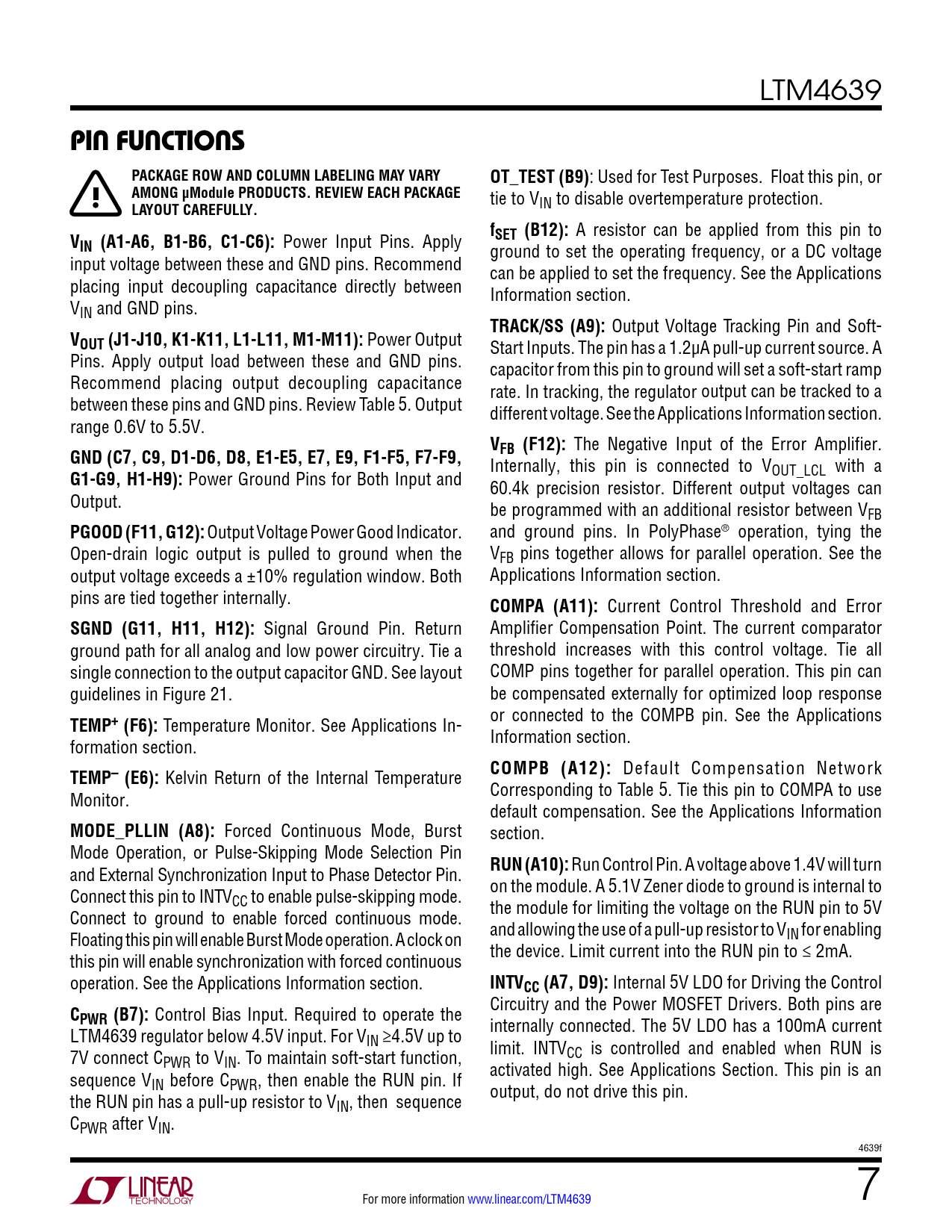 PIN FUNCTIONS. PACKAGE ROW AND COLUMN LABELING MAY VARY. OT_TEST (B9). AMONG µModule PRODUCTS. REVIEW EACH PACKAGE