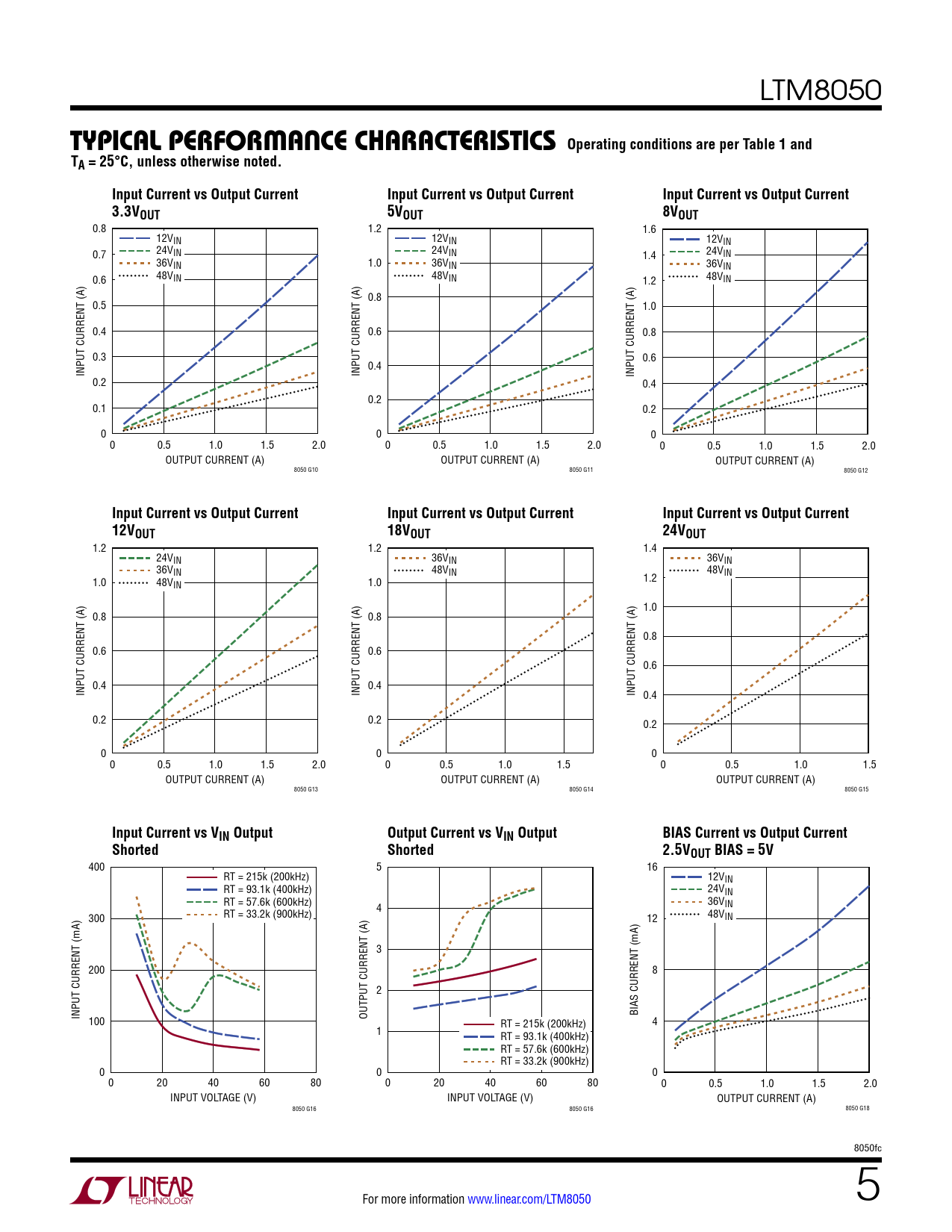 0.8 1.2 1.6 12VIN 12VIN 12VIN 0.7 24VIN 24VIN 1.4 24VIN 36VIN 1.0 36VIN 36VIN 0.6 48VIN 48VIN 1.2 48VIN 0.8 0.5 1.0 0.4 0.6 0.8 0.3 0.6 0.4 INPUT CURRENT (A) INPUT CURRENT (A) INPUT CURRENT (A) 0.2 0.4 0.2 0.1 0.2 0 0 0 0 0.5 1.0 1.5 2.0 0 0.5 1.0 1.5 2.0 0 0.5 1.0 1.5 2.0 OUTPUT CURRENT (A) OUTPUT CURRENT (A) OUTPUT CURRENT (A) 8050 G10 8050 G11 8050 G12