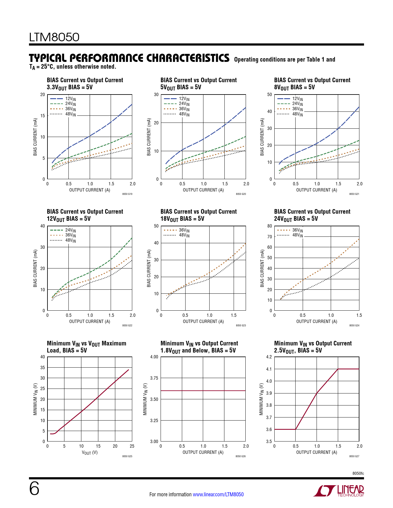 20 30 50 12VIN 12VIN 12VIN 24VIN 24VIN 24VIN 36VIN 36VIN 36V 40 IN 15 48VIN 48VIN 48VIN 20 30 10 20 10 BIAS CURRENT (mA) BIAS CURRENT (mA) BIAS CURRENT (mA) 5 10 0 0 0 0 0.5 1.0 1.5 2.0 0 0.5 1.0 1.5 2.0 0 0.5 1.0 1.5 2.0 OUTPUT CURRENT (A) OUTPUT CURRENT (A) OUTPUT CURRENT (A) 8050 G19 8050 G20 8050 G21