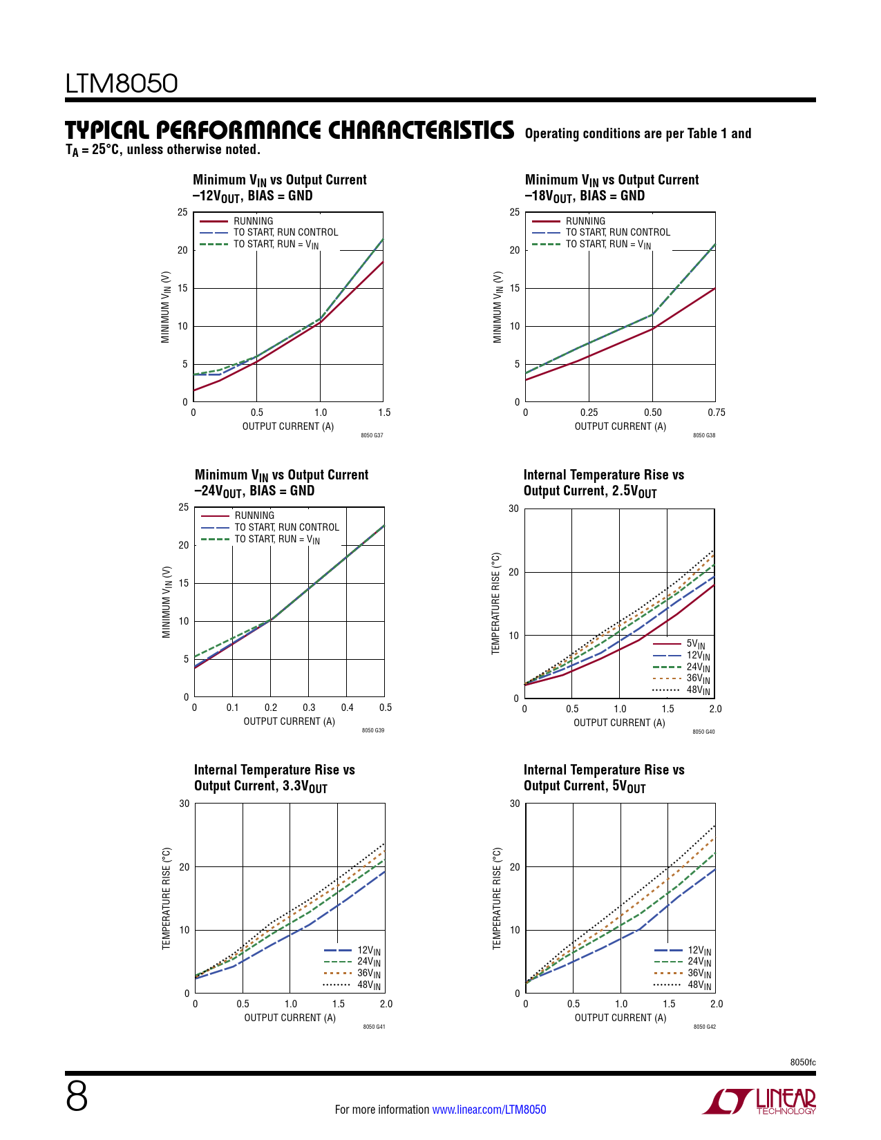 25 30 RUNNING TO START, RUN CONTROL TO START, RUN = V 20 IN 20 (V) IN 15 TURE RISE (°C) 10 MINIMUM V 10 5V TEMPERA IN 12V 5 IN 24VIN 36VIN 48VIN 0 0 0 0.1 0.2 0.3 0.4 0.5 0 0.5 1.0 1.5 2.0 OUTPUT CURRENT (A) OUTPUT CURRENT (A) 8050 G39 8050 G40