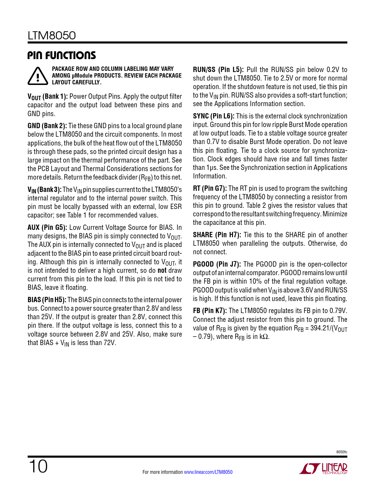 PIN FUNCTIONS. PACKAGE ROW AND COLUMN LABELING MAY VARY. RUN/SS (Pin L5):. AMONG µModule PRODUCTS. REVIEW EACH PACKAGE