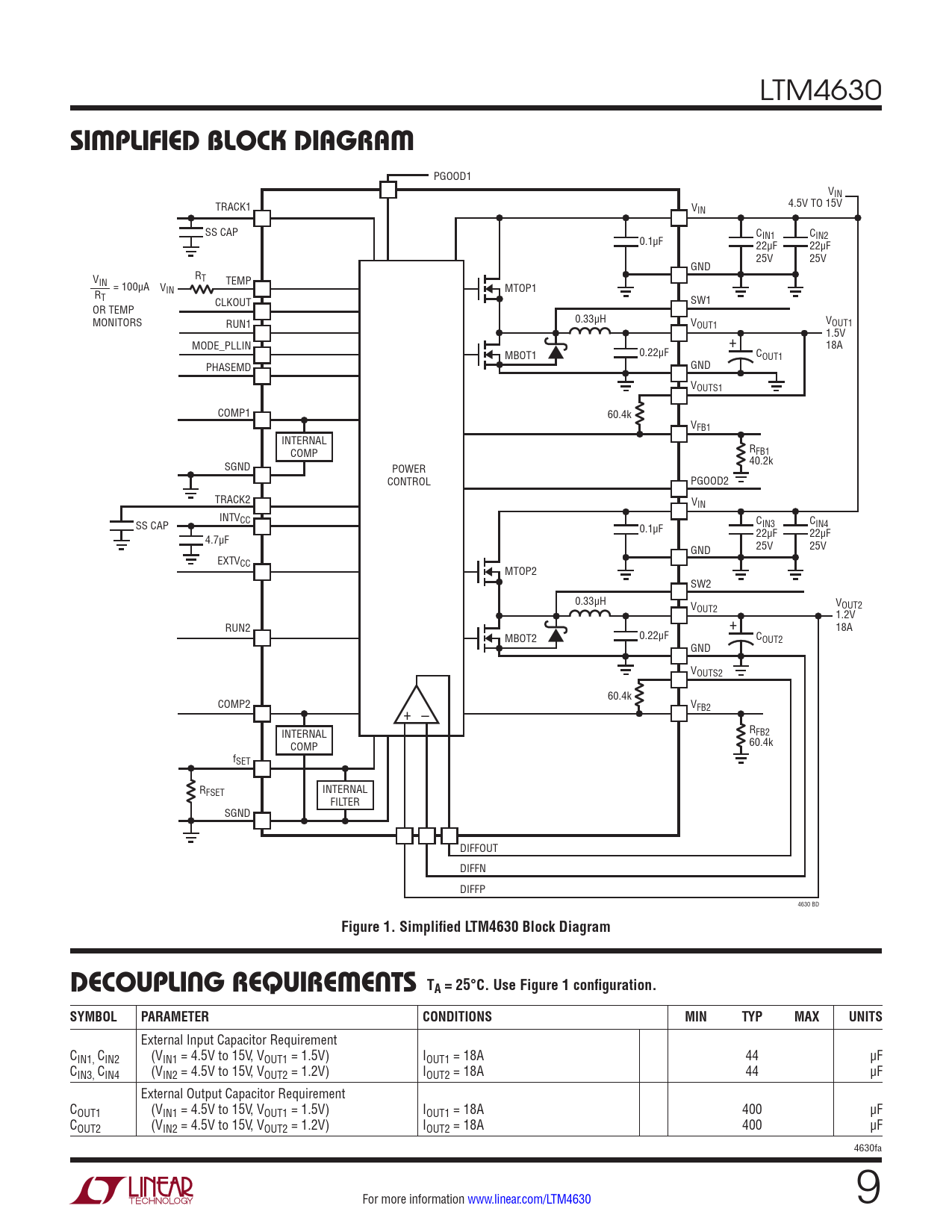 Figure 1. Simplified LTM4630 Block Diagram DECOUPLING REQUIREMENTS TA = 25°C. Use Figure 1 configuration. SYMBOL PARAMETER CONDITIONS MIN TYP MAX UNITS