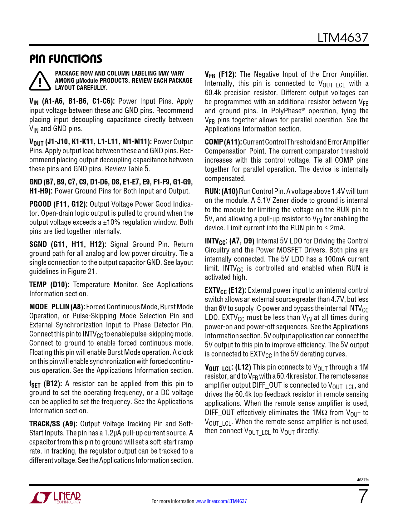 pin FuncTions PACKAGE ROW AND COLUMN LABELING MAY VARY VFB (F12): AMONG µModule PRODUCTS REVIEW EACH PACKAGE