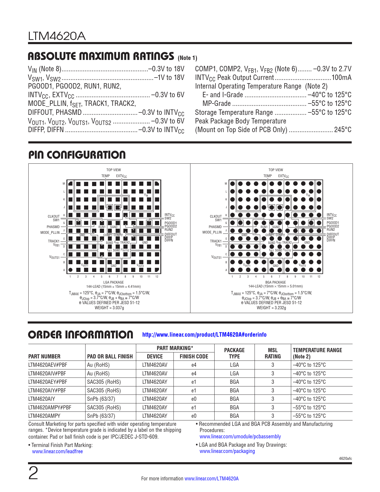ABSOLUTE MAXIMUM RATINGS (Note 1). PIN CONFIGURATION. ORDER INFORMATION http://www.linear.com/product/LTM4620A#orderinfo