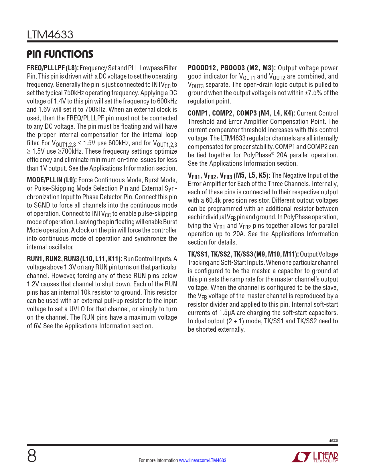pin FuncTions. FREQ/PLLLPF (L8):. PGOOD12, PGOOD3 (M2, M3):. COMP1, COMP2, COMP3 (M4, L4, K4):. MODE/PLLIN (L9):
