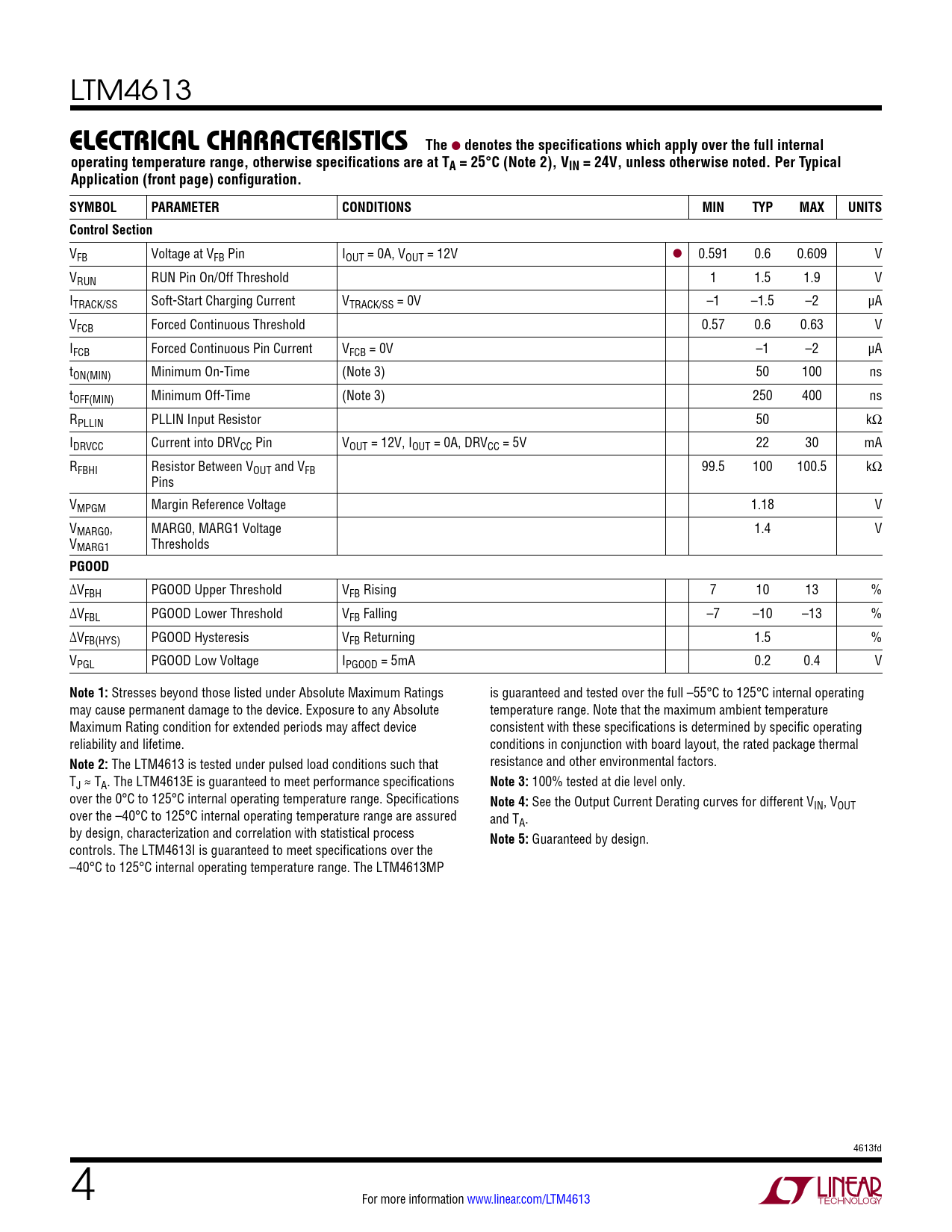 Guaranteed by design. controls. The LTM4613I is guaranteed to meet specifications over the –40°C to 125°C internal operating temperature range. The LTM4613MP 4613fd 4 For more information www.linear.com/LTM4613 Document Outline Features Description Applications Typical Application Absolute Maximum Ratings Pin Configuration Electrical Characteristics Typical Performance Characteristics Pin Functions Block Diagram Decoupling Requirements Operation Applications Information Package Photograph Related Parts