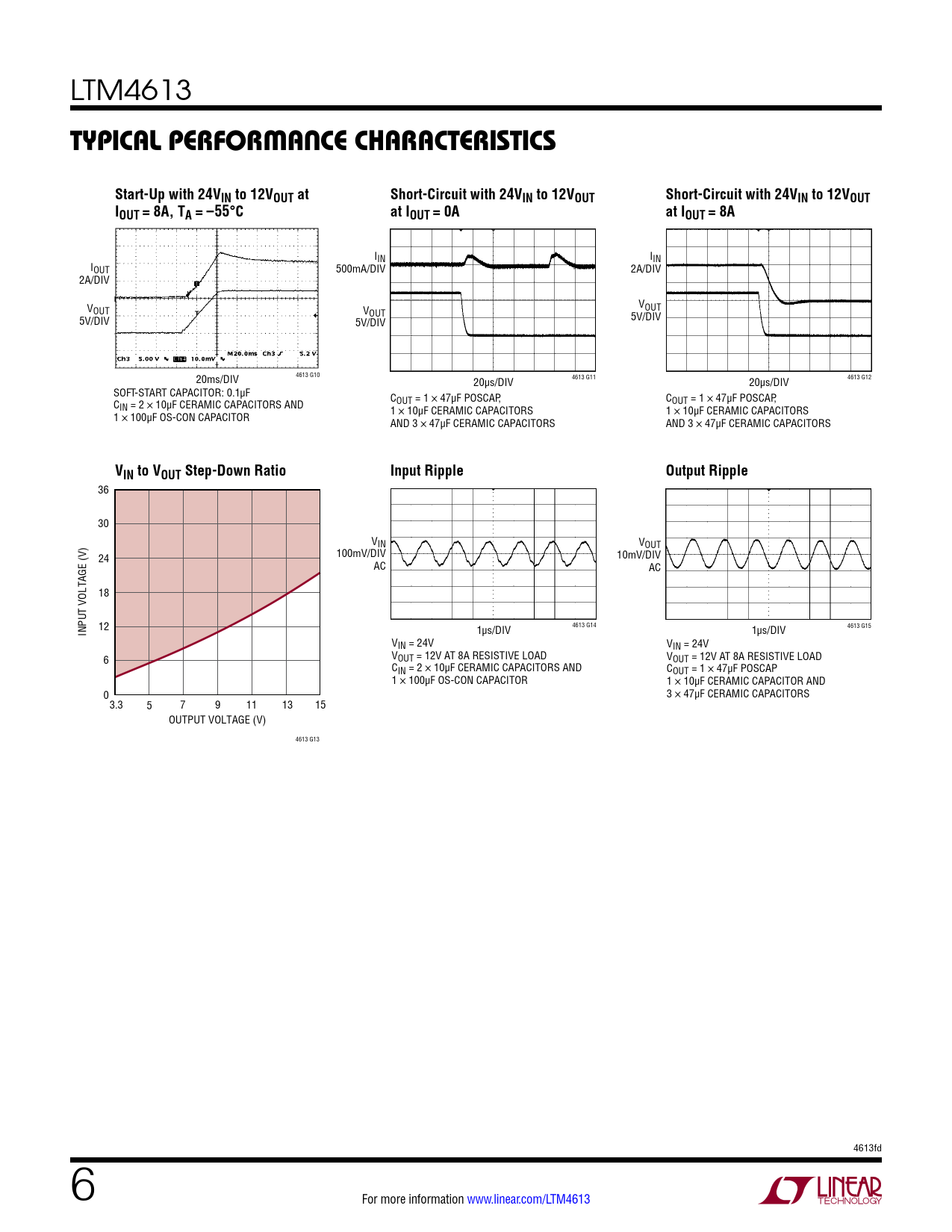 IIN IIN IOUT 500mA/DIV 2A/DIV 2A/DIV V V OUT V OUT OUT 5V/DIV 5V/DIV 5V/DIV 20ms/DIV 4613 G10 20µs/DIV 4613 G11 20µs/DIV 4613 G12 SOFT-START CAPACITOR: 0.1µF C COUT = 1 × 47µF POSCAP, COUT = 1 × 47µF POSCAP, IN = 2 × 10µF CERAMIC CAPACITORS AND 1 × 100µF OS-CON CAPACITOR 1 × 10µF CERAMIC CAPACITORS 1 × 10µF CERAMIC CAPACITORS AND 3 × 47µF CERAMIC CAPACITORS AND 3 × 47µF CERAMIC CAPACITORS