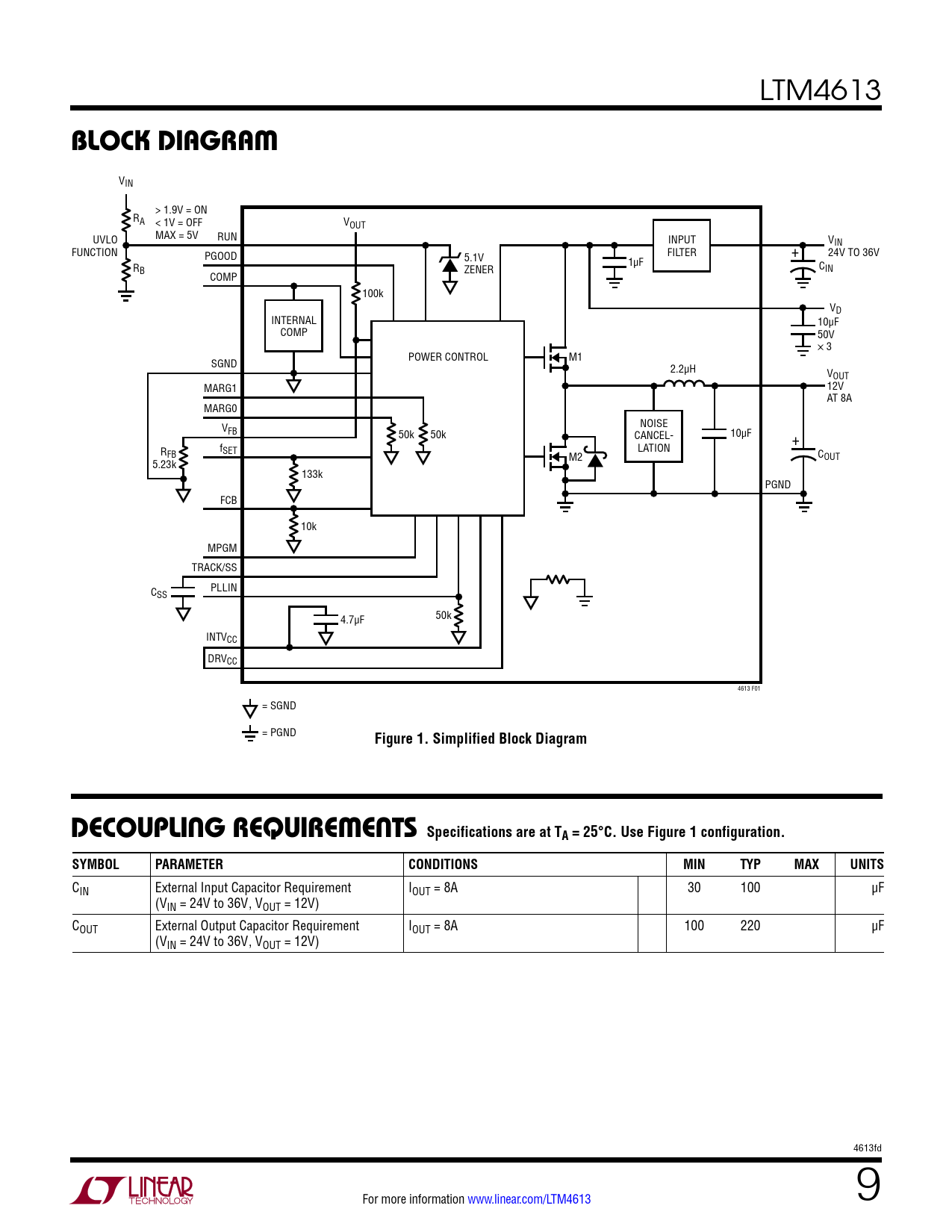 CIN External Input Capacitor Requirement IOUT = 8A 30 100 µF (VIN = 24V to 36V, VOUT = 12V) COUT External Output Capacitor Requirement IOUT = 8A 100 220 µF (VIN = 24V to 36V, VOUT = 12V) 4613fd For more information www.linear.com/LTM4613 9 Document Outline Features Description Applications Typical Application Absolute Maximum Ratings Pin Configuration Electrical Characteristics Typical Performance Characteristics Pin Functions Block Diagram Decoupling Requirements Operation Applications Information Package Photograph Related Parts