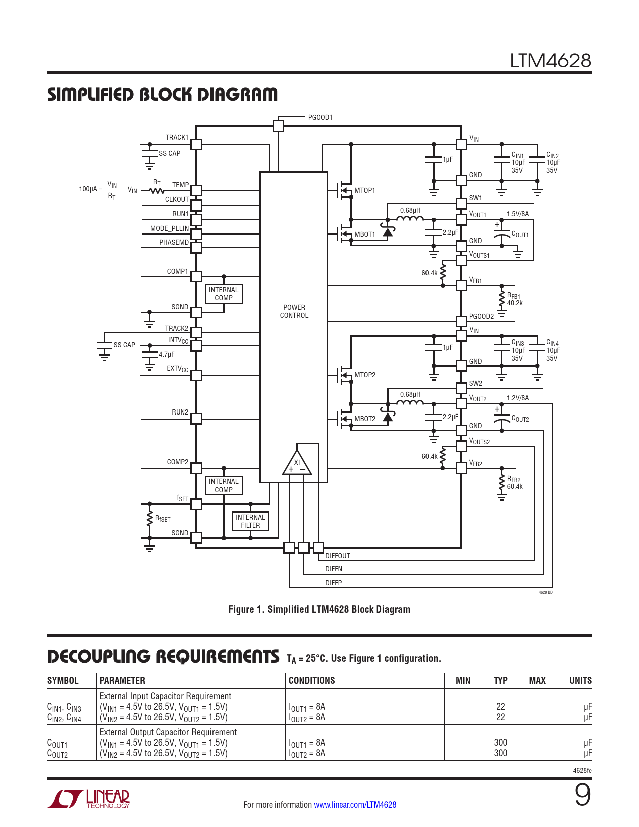 Figure 1. Simplified LTM4628 Block Diagram DECOUPLING REQUIREMENTS TA = 25°C. Use Figure 1 configuration. SYMBOL PARAMETER CONDITIONS MIN TYP MAX UNITS