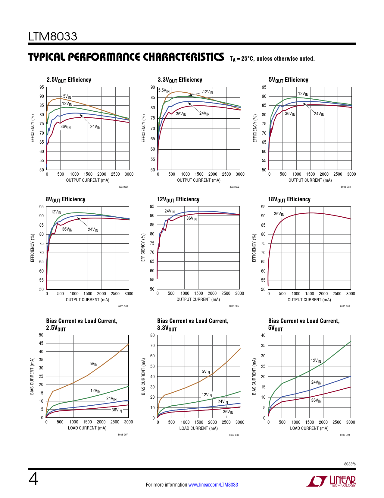 95 95 95 12VIN 24VIN 90 90 36VIN 36V 90 IN 85 85 85 36VIN 24VIN 80 80 80 75 75 75 70 70 70 EFFICIENCY (%) 65 EFFICIENCY (%) 65 EFFICIENCY (%) 65 60 60 60 55 55 55 50 50 50 0 500 1000 1500 2000 2500 3000 0 500 1000 1500 2000 2500 3000 0 500 1000 1500 2000 2500 3000 OUTPUT CURRENT (mA) OUTPUT CURRENT (mA) OUTPUT CURRENT (mA) 8033 G04 8033 G05 8033 G06
